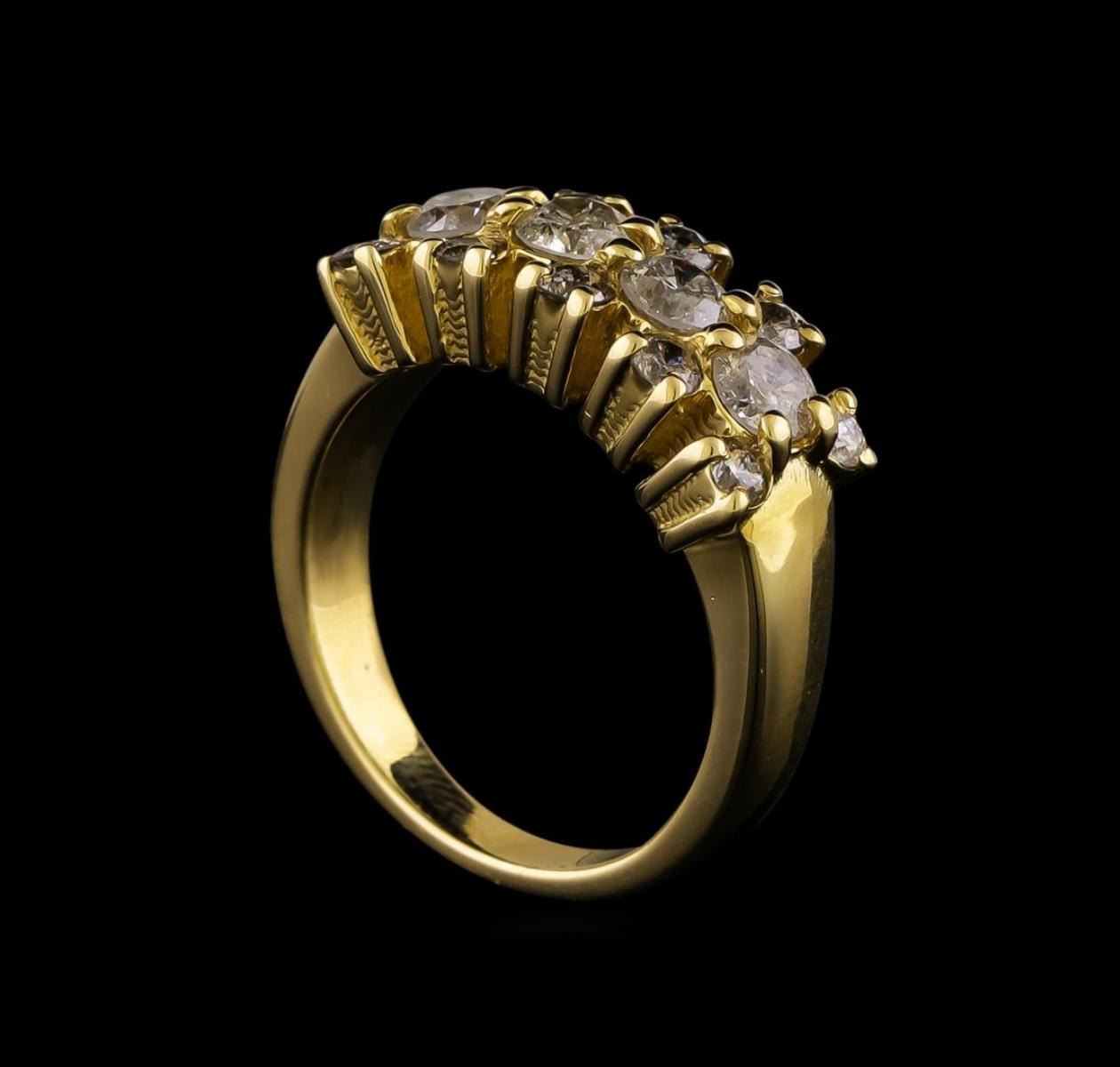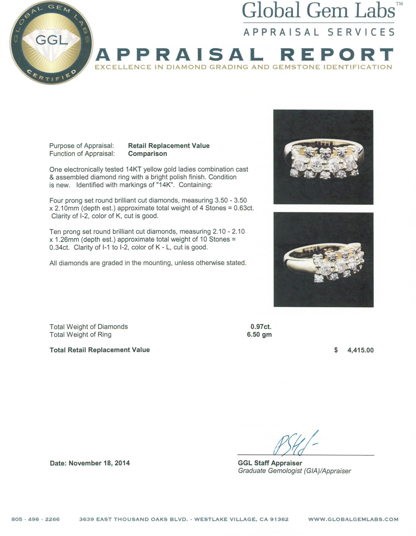 One electronically tested 14KT yellow gold ladies combination cast & assembled diamond ring with a bright polish finish. Identified with markings of "14K". Condition is new. Containing: Four prong set round brilliant cut diamonds, measuring 3.50 - 3.50 x 2.10mm (depth est.) approximate total weight of 4 Stones = 0.63ct. Clarity: I-2. Color: K, Cut is Good. Ten prong set round brilliant cut diamonds, measuring 2.10 - 2.10 x 1.26mm (depth est.) approximate total weight of 10 Stones = 0.34ct. Clarity: I-1 to I-2. Color: K - L, Cut is Good. All diamonds are graded in the mounting, unless otherwise stated. Total Weight of Diamonds 0.97ct. Total Weight of Ring 6.50 grams. GGL Appraised.