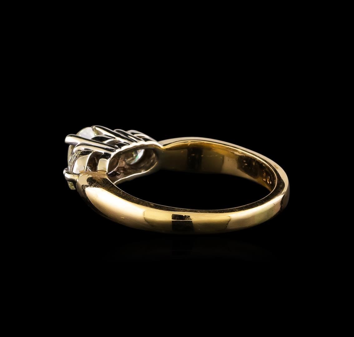 One electronically tested 14KT yellow gold ladies combination cast & assembled engagement ring with a bright polish finish. Identified with markings of "14K". Condition is very good. Containing: One prong set round brilliant cut diamond, measuring 5.16 - 5.13 x 3.09mm (depth est.) approximate weight of 0.50 ct. Clarity: SI-2. Color: K, Cut is Good. Two prong set round brilliant cut diamonds, measuring 3.86 - 3.86 x 2.01mm (depth est.) approximate total weight of 2 Stones = 0.47ct. Clarity: SI-1 to SI-2. Color: J, Cut is Good. All diamonds are graded in the mounting, unless otherwise stated. Total Weight of Diamonds 0.97ct. Total Weight of Ring 4.20 grams. GGL Appraised.