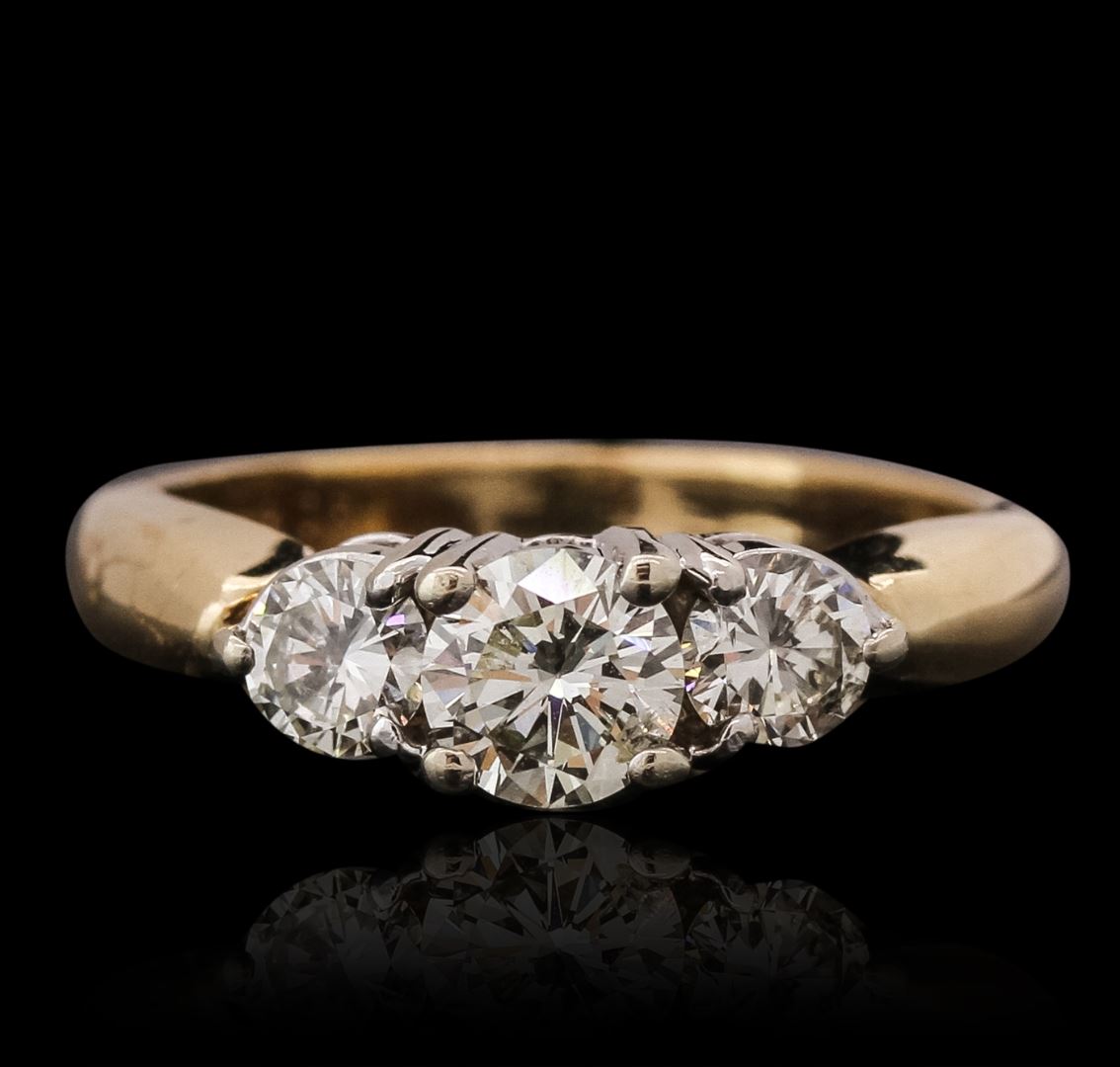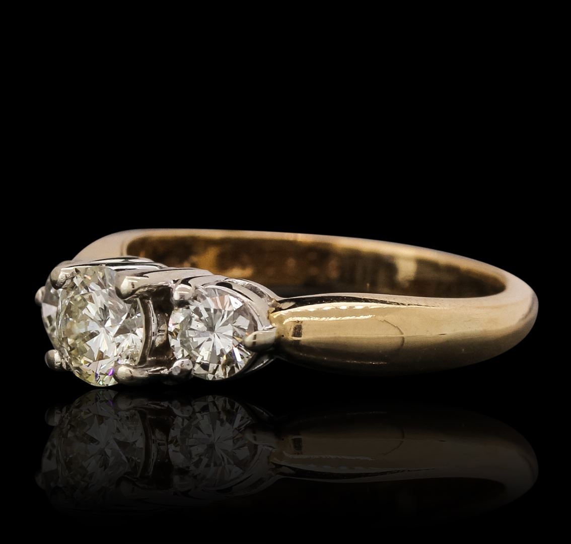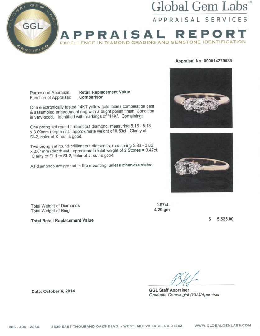One electronically tested 14KT yellow gold ladies combination cast & assembled engagement ring with a bright polish finish. Identified with markings of "14K". Condition is very good. Containing: One prong set round brilliant cut diamond, measuring 5.16 - 5.13 x 3.09mm (depth est.) approximate weight of 0.50ct. Clarity: SI-2. Color: K, Cut is Good. Two prong set round brilliant cut diamonds, measuring 3.86 - 3.86 x 2.01mm (depth est.) approximate total weight of 2 Stones = 0.47ct. Clarity: SI-1 to SI-2. Color: J, Cut is Good. All diamonds are graded in the mounting, unless otherwise stated. Total Weight of Diamonds 0.97ct. Total Weight of Ring 4.20 grams. GGL Appraised at $5,535.00.