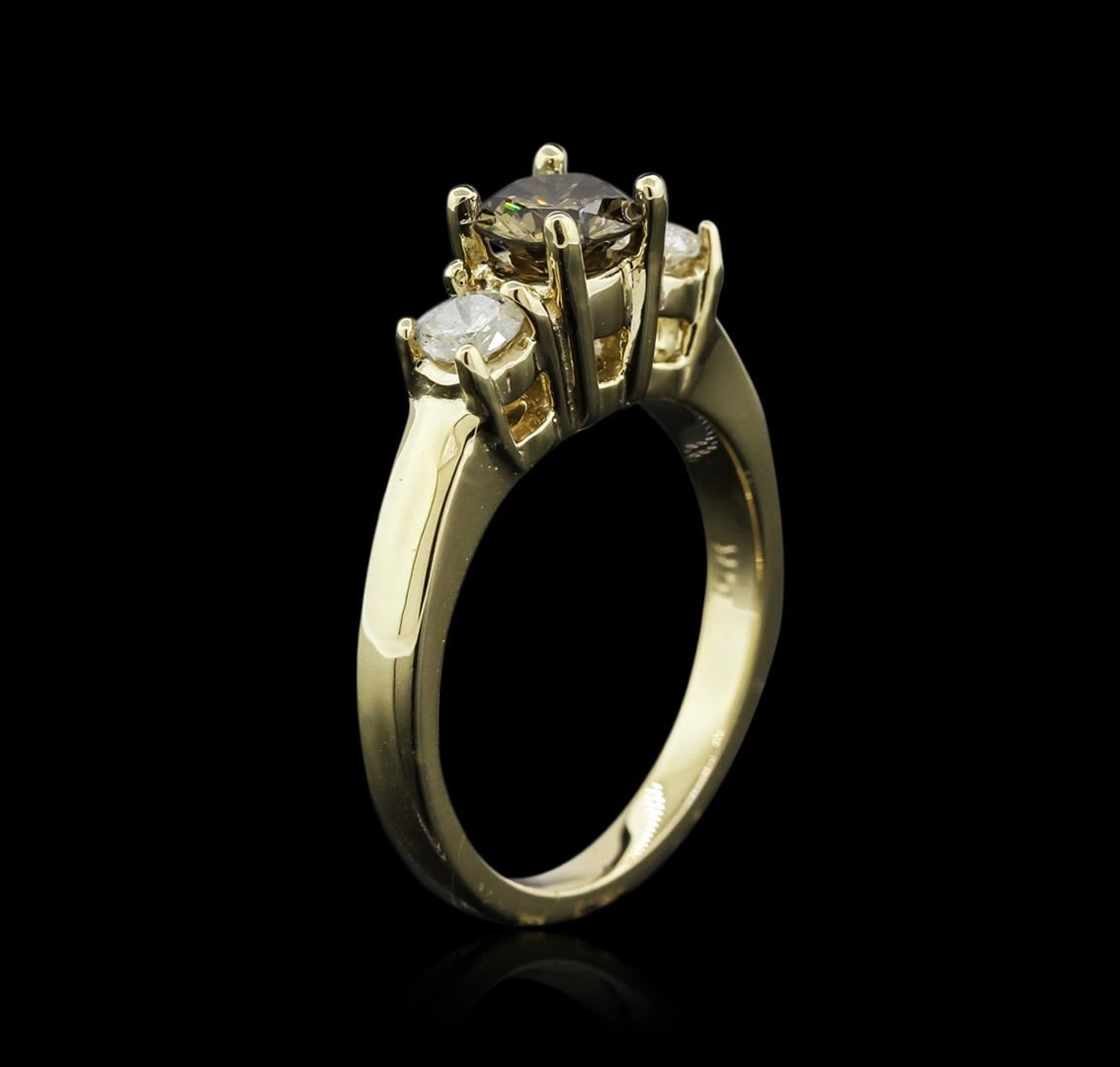 One ring featuring: 14KT yellow gold weighing 4.80 grams containing one brown diamond center stone with a total weight of 0.65ct and two side diamonds with a total weight of 0.33ct.