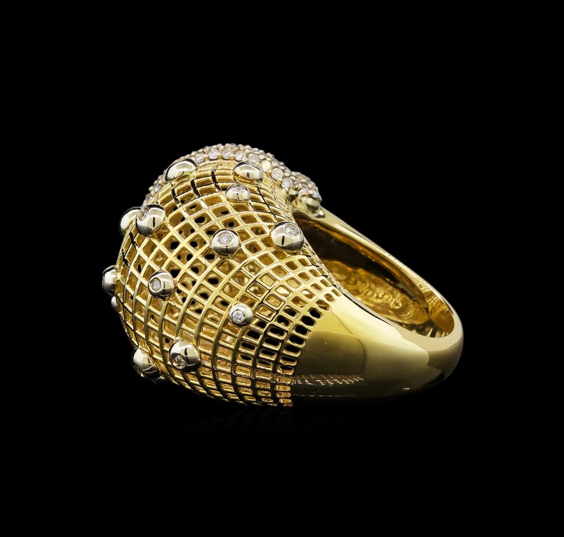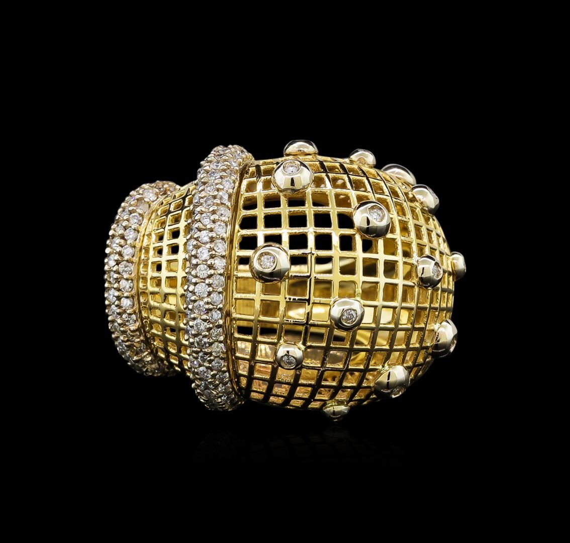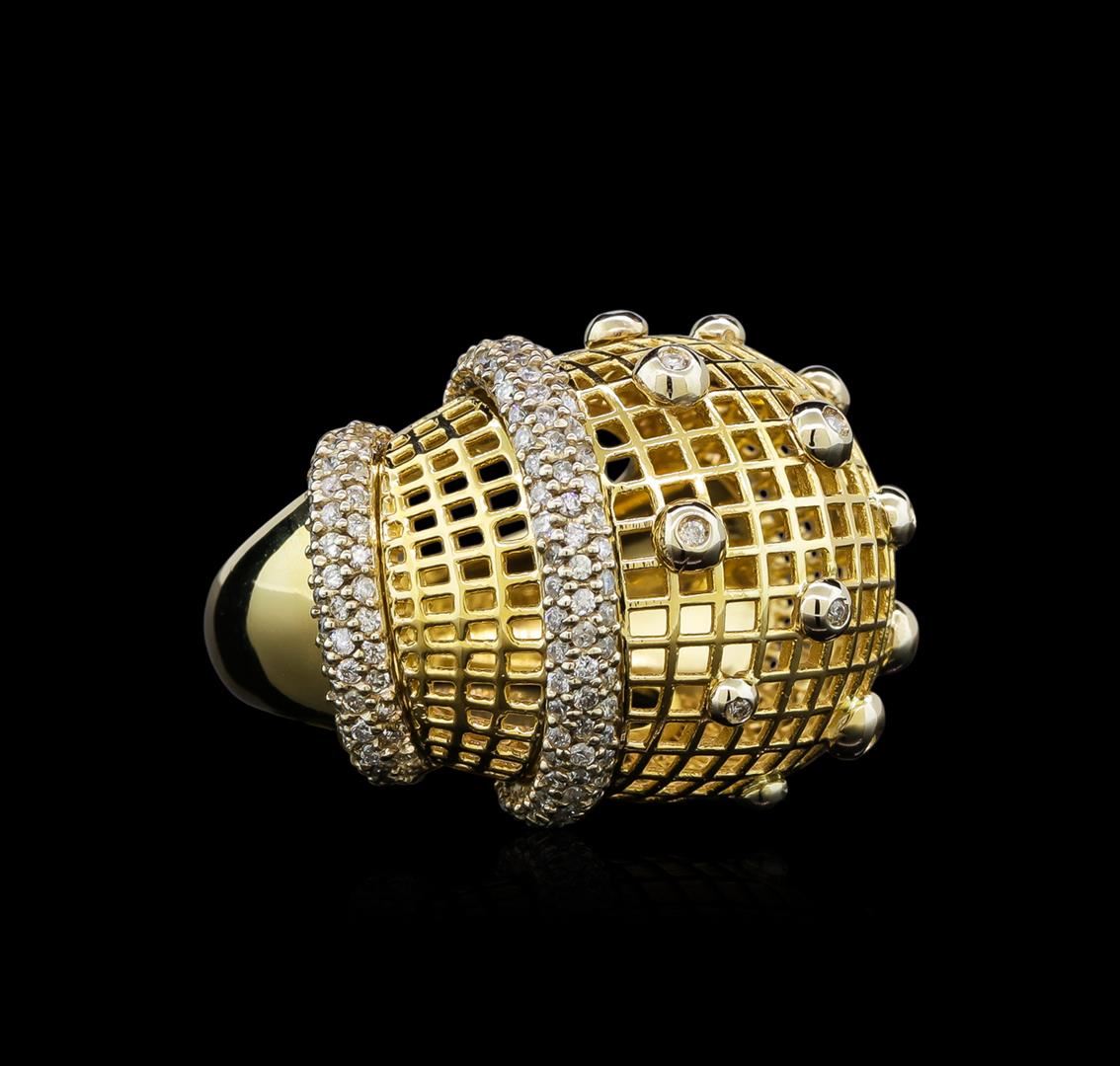 One electronically tested 14KT yellow gold ladies cast diamond ring with a bright polish finish. Identified with markings of "14K". Condition is new. Containing: One Hundred Sixty prong set round brilliant cut diamonds, measuring 1.00 - 1.00 x 0.60mm (depth est.) approximate total weight of 160 Stones = 0.98ct. Clarity: SI-2 to I-1. Color: I - J. All diamonds are graded in the mounting, unless otherwise stated. Total Weight of Diamonds 0.98ct. Total Weight of Ring 14.10 grams. GGL Appraised at $4,680.00.