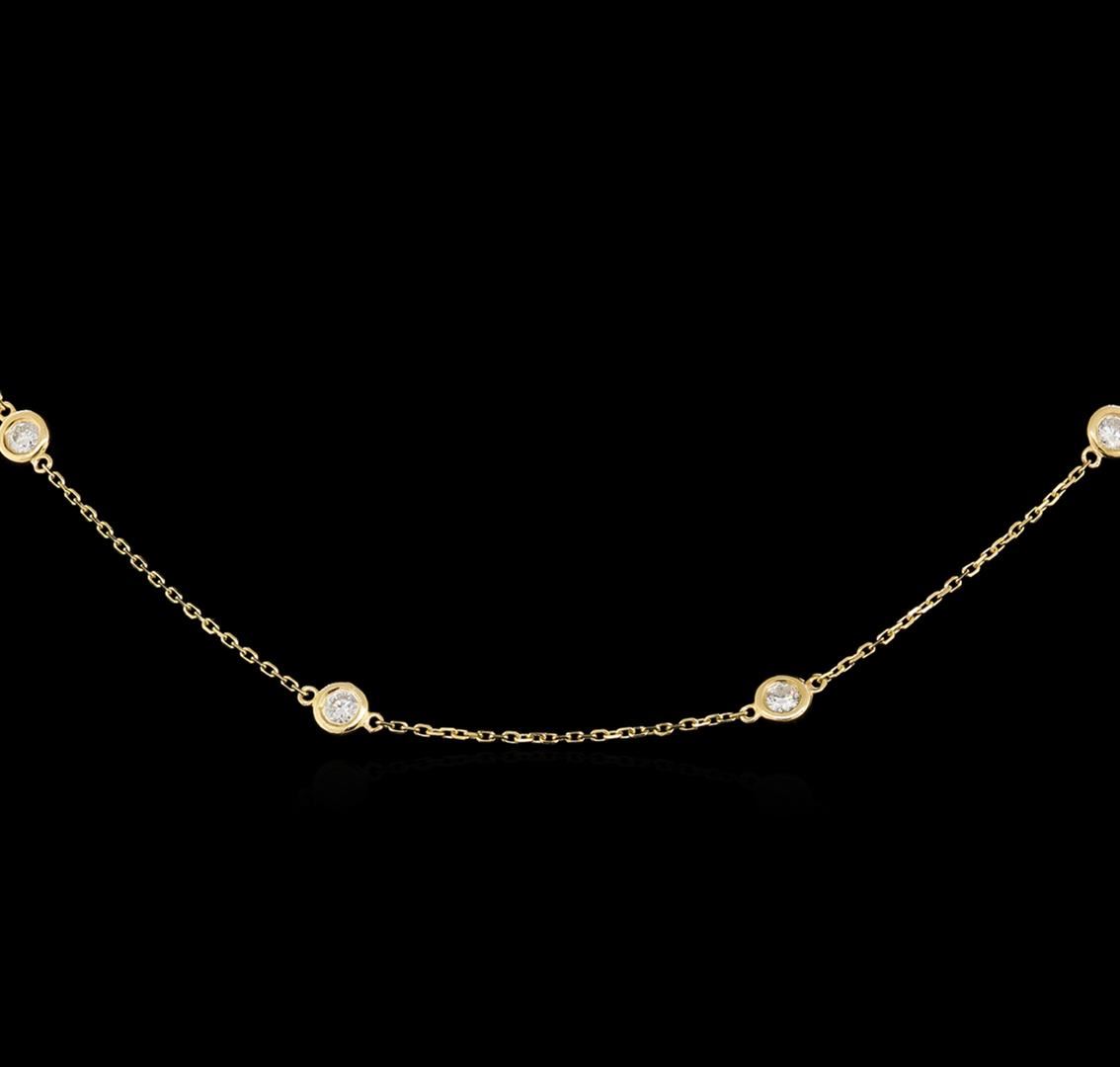 One electronically tested 14KT yellow gold ladies cast diamond necklace with a lobster claw clasp with a bright polish finish. Measurements: 18" in length Identified with markings of "K14". Condition is new. Containing: Ten bezel set round brilliant cut diamonds, measuring 3.00 - 3.00 x 1.80mm (depth est.) approximate total weight of 10 Stones = 0.99ct. Clarity: SI-1 to I-1. Color: K, Cut is Good. All diamonds are graded in the mounting, unless otherwise stated. Total Weight of Diamonds 0.99ct. Total Weight of Necklace 4.20 grams. GGL Appraised at $3,035.00.