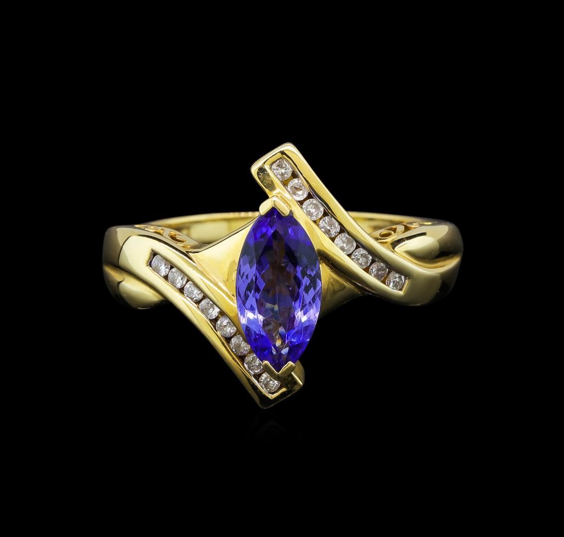 One electronically tested 14KT yellow gold ladies cast tanzanite and diamond ring with a bright polish finish. Identified with markings of "14K". Condition is new. Containing: One prong set marquise modified brilliant cut natural tanzanite, measuring 10.00 x 4.90 x 3.19mm, approximate weight of 0.99ct., clarity is eye clean, type I, medium light, very slightly grayish, violet color, (GIA V 4/3), cut is good. Sixteen channel set round brilliant cut diamonds, measuring 1.30 - 1.30 x 0.78mm (depth est.) approximate total weight of 16 Stones = 0.13ct. Clarity: I-1 to I-2. Color: I - J. Colored gemstones are presumed to have been subjected to commonly used enhancement processes. All diamonds and colored gemstones are graded in the mounting, unless otherwise stated. Total Weight of Colored Stones 0.99ct. Total Weight of Diamonds 0.13ct. Total Weight of Ring 4.90 grams. GGL Appraised at $1,745.00.