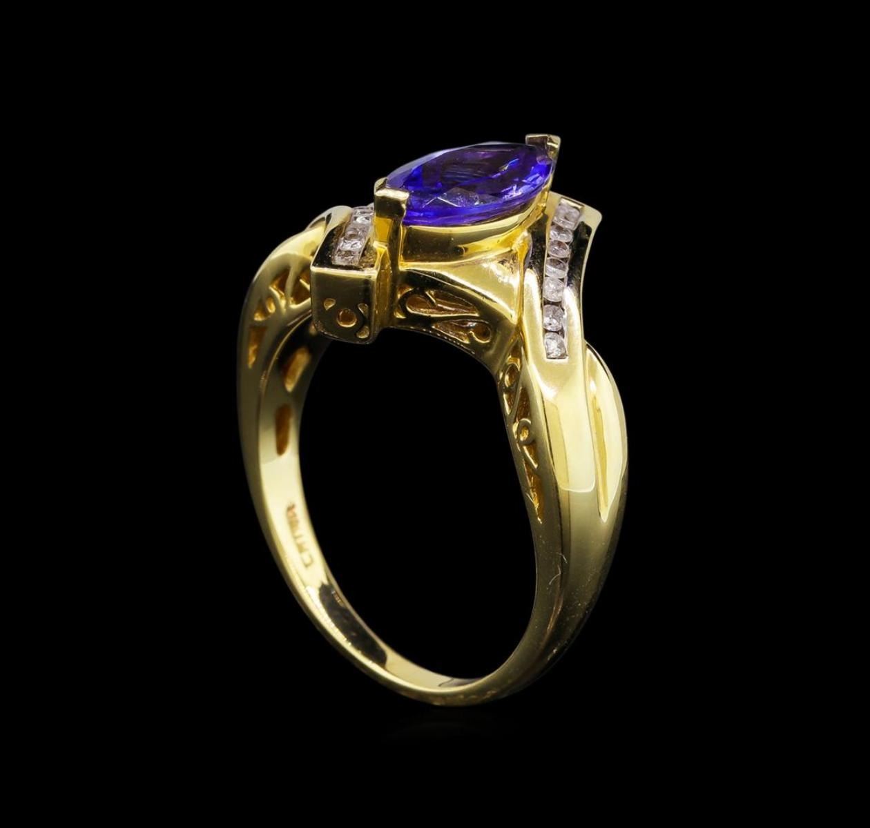 One electronically tested 14KT yellow gold ladies cast tanzanite and diamond ring with a bright polish finish. Identified with markings of "14K". Condition is new. Containing: One prong set marquise modified brilliant cut natural tanzanite, measuring 10.00 x 4.90 x 3.19mm, approximate weight of 0.99ct., clarity is eye clean, type I, medium light, very slightly grayish, violet color, (GIA V 4/3), cut is good. Sixteen channel set round brilliant cut diamonds, measuring 1.30 - 1.30 x 0.78mm (depth est.) approximate total weight of 16 Stones = 0.13ct. Clarity: I-1 to I-2. Color: I - J. Colored gemstones are presumed to have been subjected to commonly used enhancement processes. All diamonds and colored gemstones are graded in the mounting, unless otherwise stated. Total Weight of Colored Stones 0.99ct. Total Weight of Diamonds 0.13ct. Total Weight of Ring 4.90 grams. GGL Appraised.