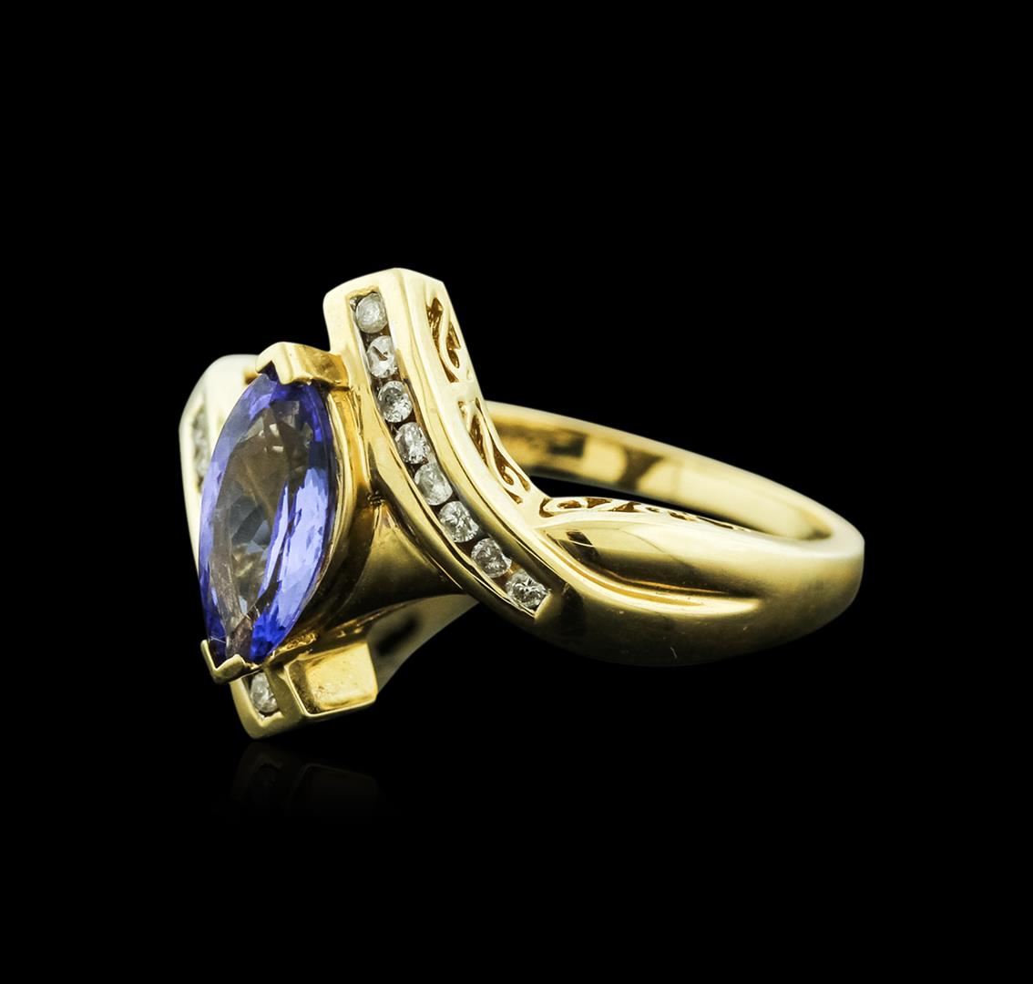 One electronically tested 14KT yellow gold ladies cast tanzanite and diamond ring with a bright polish finish. Identified with markings of "14K". Condition is new. Containing: One prong set marquise modified brilliant cut natural tanzanite, measuring 10.00 x 4.90 x 3.19mm, approximate weight of 0.99ct., clarity is eye clean, type I, medium light, very slightly grayish, violet color, (GIA V 4/3), cut is good. Sixteen channel set round brilliant cut diamonds, measuring 1.30 - 1.30 x 0.78mm (depth est.) approximate total weight of 16 Stones = 0.13ct. Clarity: I-1 to I-2. Color: I - J. Colored gemstones are presumed to have been subjected to commonly used enhancement processes. All diamonds and colored gemstones are graded in the mounting, unless otherwise stated. Total Weight of Colored Stones 0.99ct. Total Weight of Diamonds 0.13ct. Total Weight of Ring 4.90 grams. GGL Appraised at $1,745.00.