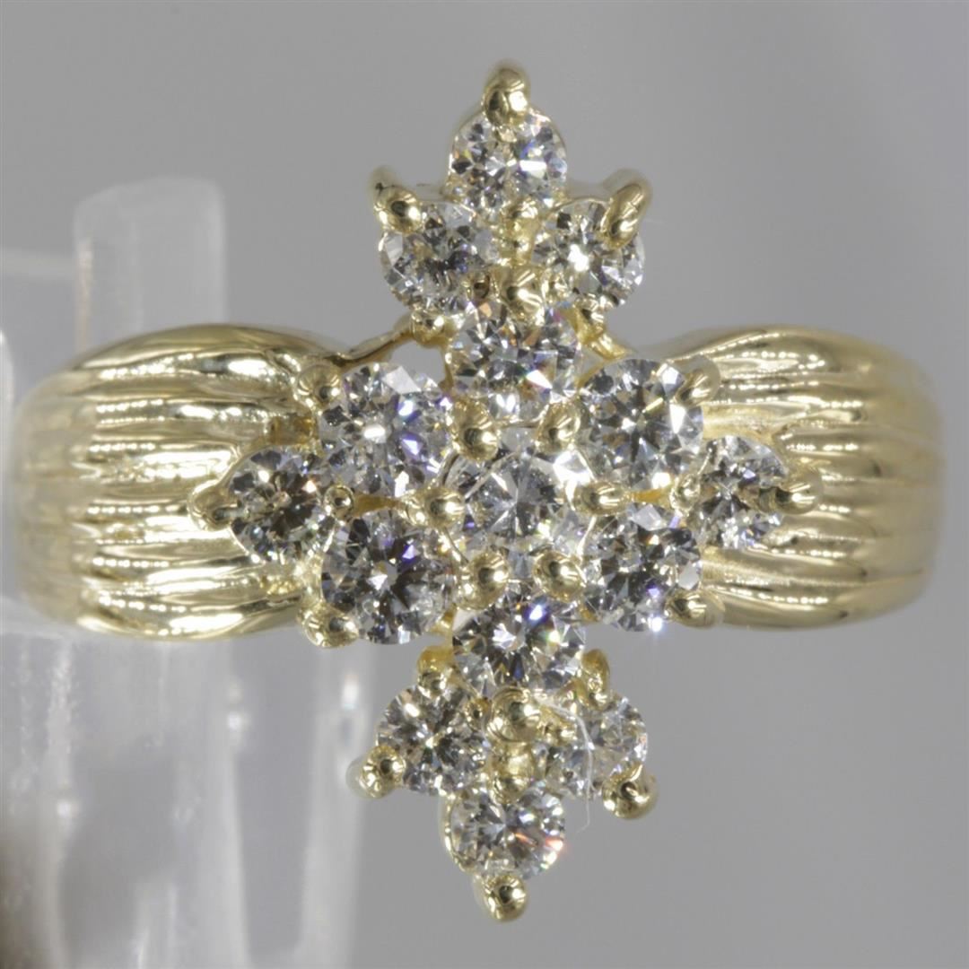 One Diamond Cluster Ring in 14k Yellow Gold. Gross weight is 5.04 grams with a total of 15 stones. Size 6.5 but resizable. Condition is brand new. Main diamond weight is 1.00 Ct, shape is round brilliant cut, clarity SI1/SI2, color G-H, and cut is excellent.