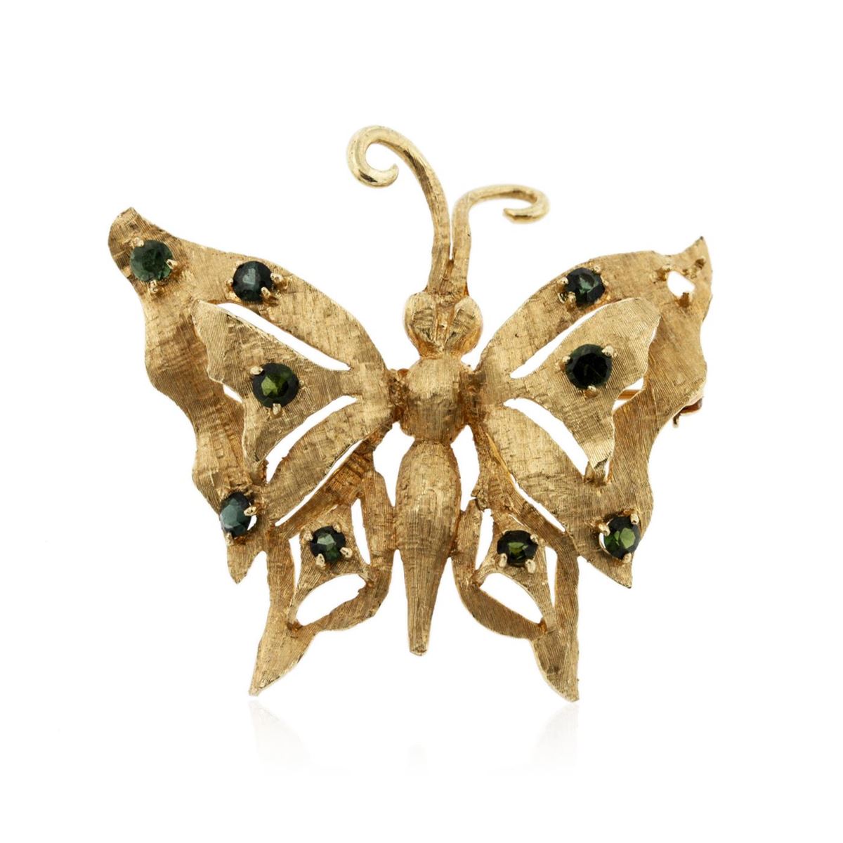 One electronically tested 14KT yellow gold ladies cast & assembled multi gemstone butterfly brooch with a bright and textured finish. Area measurements 1.50 x 1.75 inch. Condition is good. Containing: Ten prong set round mixed cut natural green tourmaline and peridots, measuring 2.90 - 2.50 x 1.76 mm, approximate total weight of 1.00ct., clarity is slightly included, dark, very slightly grayish, slightly yellowish green color, (GIA slyG 7/3), cut is good. Transmitting light with a minimum of distortion, transparent. Naturally occurring internal & external characteristics are present. Graded in the setting. Total Weight of Colored Stones 1.00ct. Total Weight of Brooch 7.70 grams. AIG Appraised.
