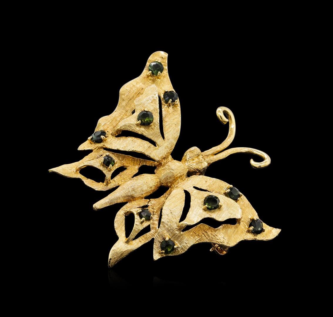 One electronically tested 14KT yellow gold ladies cast & assembled multi gemstone butterfly brooch with a bright and textured finish. Area measurements 1.50 x 1.75 inch. Condition is good. Containing: Ten prong set round mixed cut natural green tourmaline and peridots, measuring 2.90 - 2.50 x 1.76 mm, approximate total weight of 1.00ct., clarity is slightly included, dark, very slightly grayish, slightly yellowish green color, (GIA slyG 7/3), cut is good. Transmitting light with a minimum of distortion, transparent. Naturally occurring internal & external characteristics are present. Graded in the setting. Total Weight of Colored Stones 1.00ct. Total Weight of Brooch 7.70 grams. AIG Appraised.