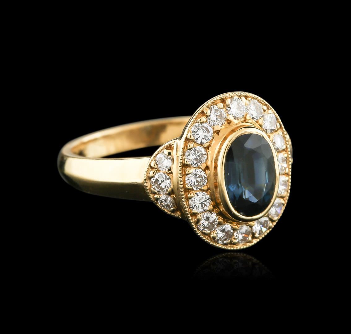 One ring featuring: Metal: 14k Solid Yellow Gold. Face Measurements: 14 x 14mm. Size: 6. Shank Width: 2.5mm. Finish: Bright Polish. Total Item Weight: 3.6 grams. Markings: Stamped 14K. Main Stone: Sapphire. Quantity: 1. Shape: Oval. Color: Blue. Carat Total Weight: 1.00. Measurements: 5 x 7mm. Treatment: None. Setting: Bezel. Hue: Blue. Saturation: Moderately Strong. Tone: Dark. Clarity: Type 2. Cut: Very Good. Secondary Stone: Diamond. Quantity: 22. Shape: Round. Color: White. Carat Total Weight: 0.60. Measurements: 1.4 - 1.9mm. Treatment: None. Setting: Prong. Color Grade: H - I. Clarity: SI1 - SI2. Cut: Very Good. Excellent Workmanship. Gemstones graded in the mounting. BHGL Appraised at $3,300.00.