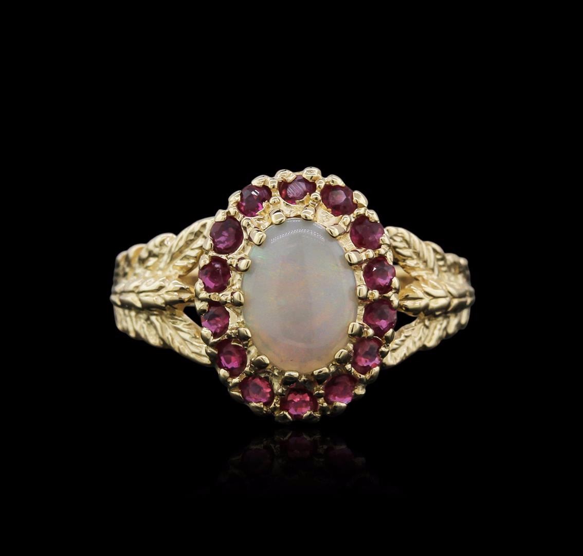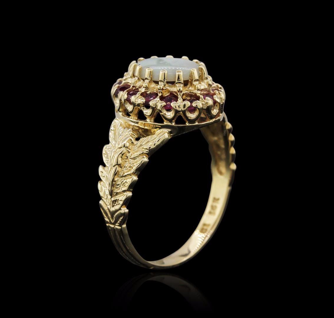One ring featuring: 14KT yellow gold weighing 3.16 grams containing one opal center stone with a total weight of 1.00ct and ruby side stones with a total weight of 0.30ct.