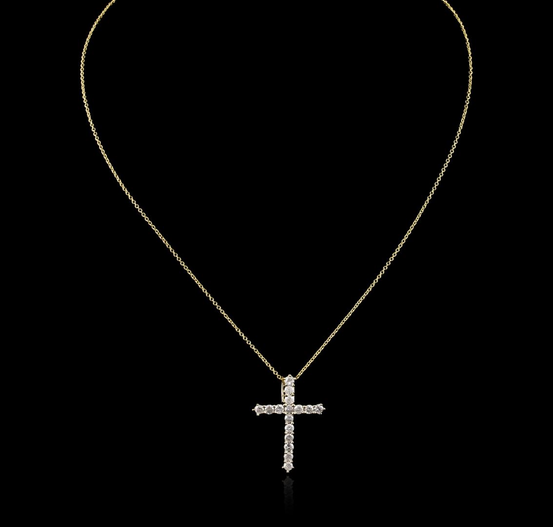 One cross pendant with chain featuring: 14KT yellow gold weighing 2.80 grams containing diamonds with a total weight of 1.00ct.
