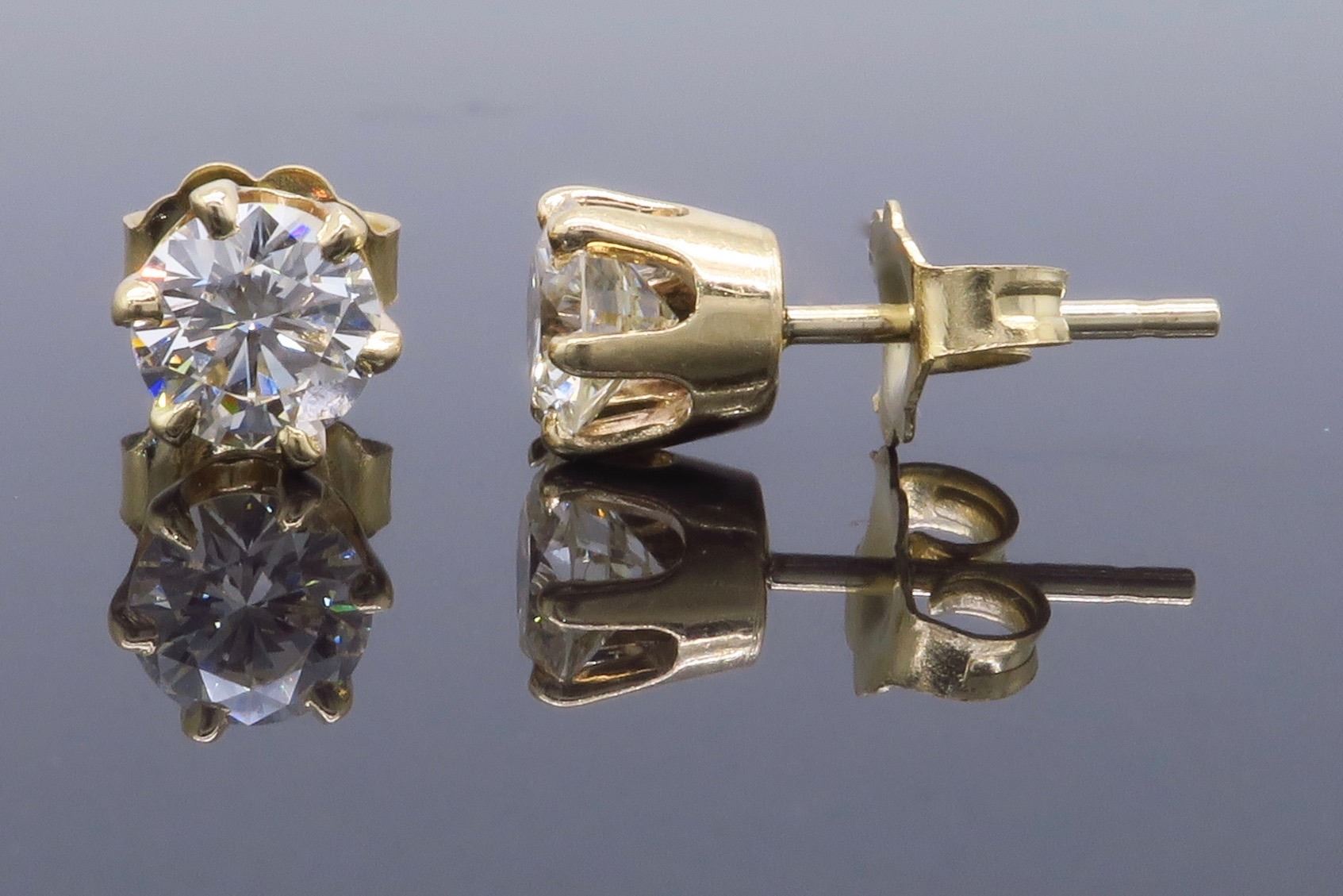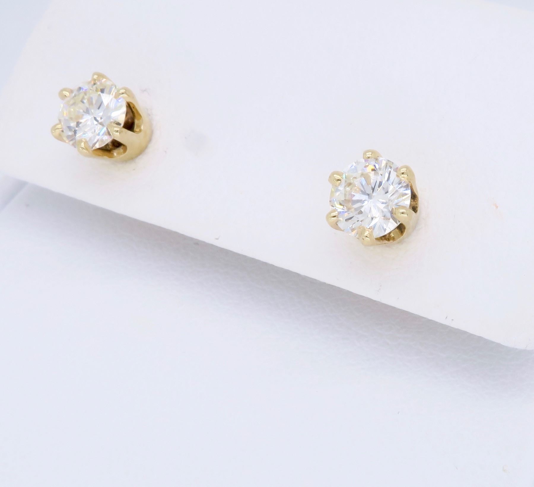 One 14KT Yellow Gold 1.00ctw Diamond Earrings. (2) Round Diamonds with a total weight of 1.00cts with a color of I-J and clarity of VS-2 to SI-1. Total weight of these earrings are 1.6 grams.