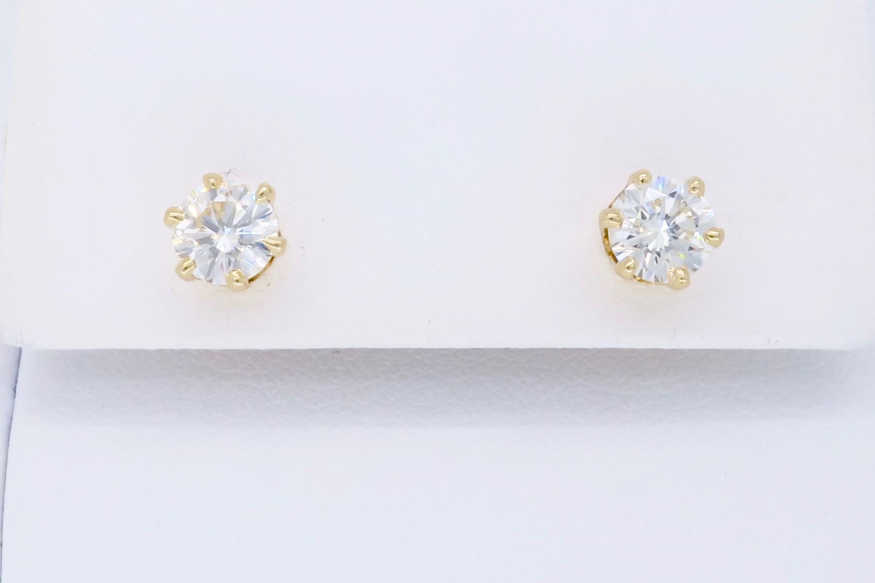 One 14KT Yellow Gold 1.00ctw Diamond Earrings. (2) Round Diamonds with a total weight of 1.00cts with a color of I-J and clarity of VS-2 to SI-1. Total weight of these earrings are 1.6 grams.