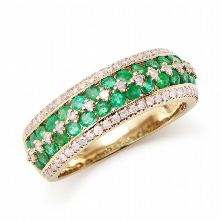 One 14KT Yellow Gold 1.00ctw Emerald and Diamond Ring. (32) Emeralds with a total weight of 1.00cts. (69) round Diamonds with a total weight of 0.26cts with a color of H-I and clarity of I-2. Total weight of this ring is 5.25 grams. Ring size is 7.5.
