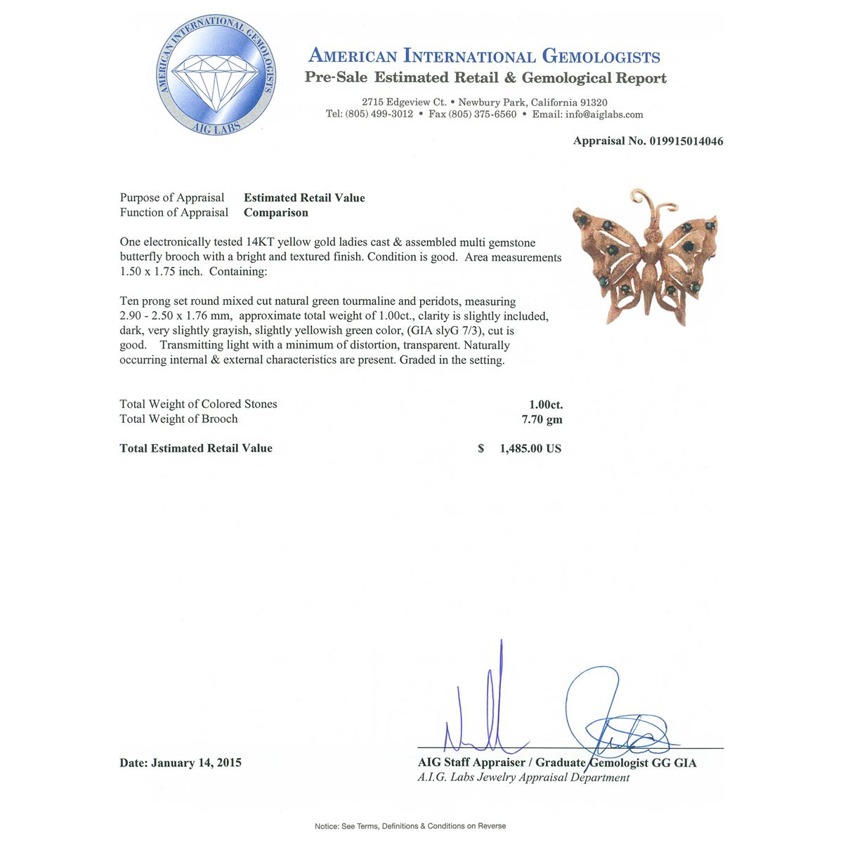 One electronically tested 14KT yellow gold ladies cast & assembled multi gemstone butterfly brooch with a bright and textured finish. Area measurements 1.50 x 1.75 inch. Condition is good. Containing: Ten prong set round mixed cut natural green tourmaline and peridots, measuring 2.90 - 2.50 x 1.76 mm, approximate total weight of 1.00ct., clarity is slightly included, dark, very slightly grayish, slightly yellowish green color, (GIA slyG 7/3), cut is good. Transmitting light with a minimum of distortion, transparent. Naturally occurring internal & external characteristics are present. Graded in the setting. Total Weight of Colored Stones 1.00ct. Total Weight of Brooch 7.70 grams. AIG Appraised.