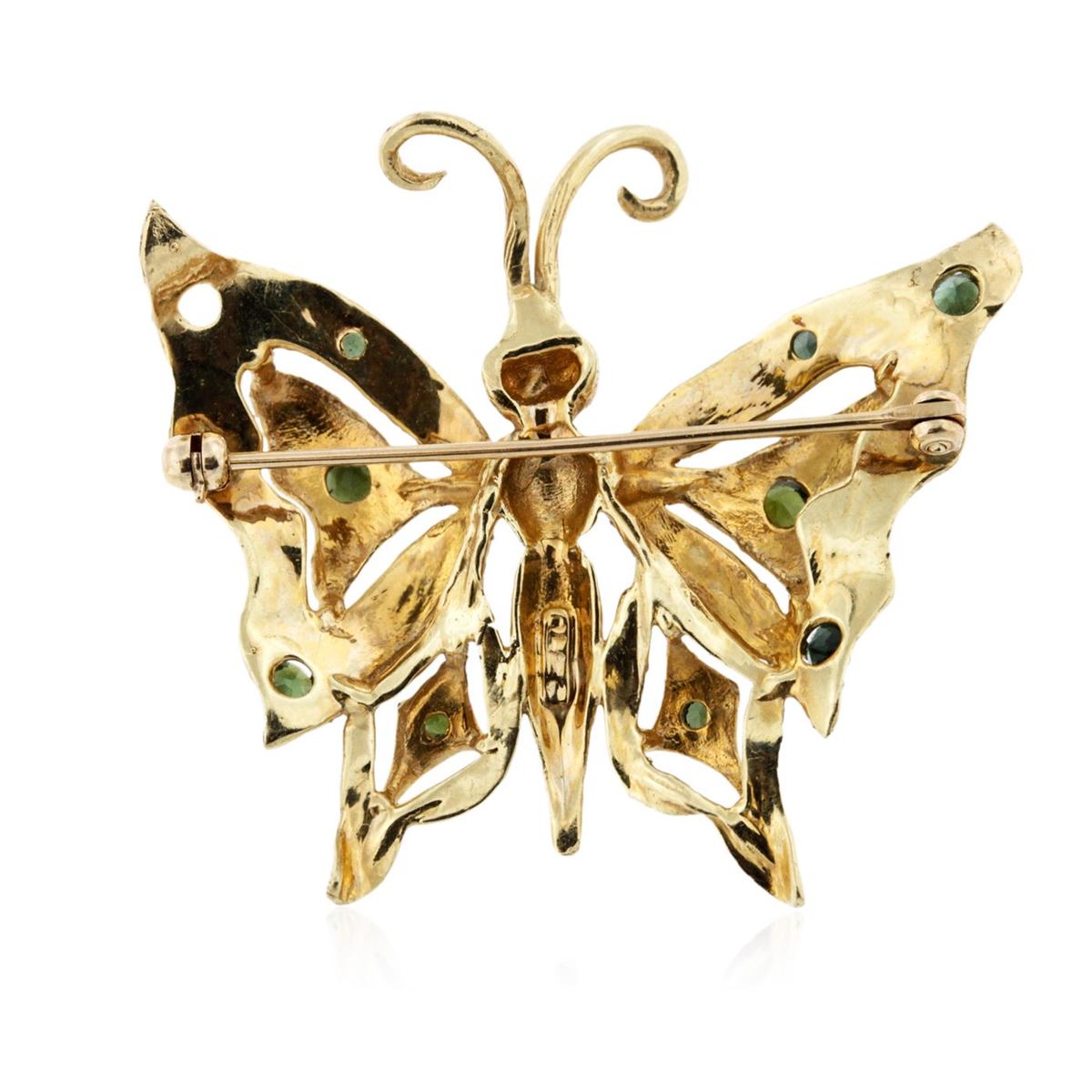 One electronically tested 14KT yellow gold ladies cast & assembled multi gemstone butterfly brooch with a bright and textured finish. Area measurements 1.50 x 1.75 inch. Condition is good. Containing: Ten prong set round mixed cut natural green tourmaline and peridots, measuring 2.90 - 2.50 x 1.76 mm, approximate total weight of 1.00ct., clarity is slightly included, dark, very slightly grayish, slightly yellowish green color, (GIA slyG 7/3), cut is good. Transmitting light with a minimum of distortion, transparent. Naturally occurring internal & external characteristics are present. Graded in the setting. Total Weight of Colored Stones 1.00ct. Total Weight of Brooch 7.70 grams. AIG Appraised.