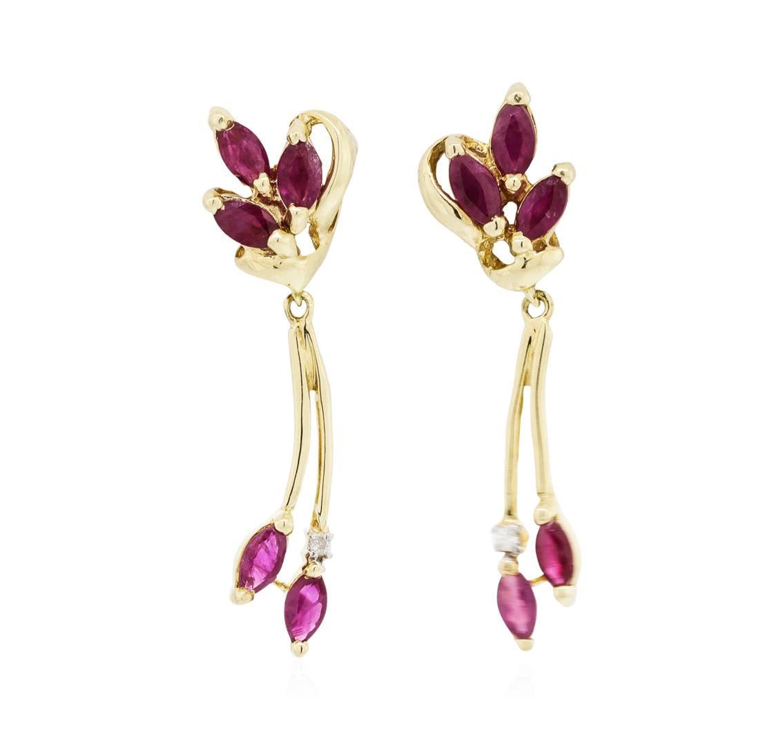 One pair of lady's dangle earring featuring: 14KT yellow gold weighing 2.4 grams containing ruby weighing 1.00ctw and diamonds weighing 0.02ctw.