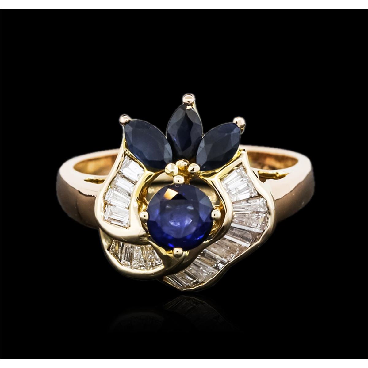 One ring featuring: 14KT yellow gold weighing 6.30 grams containing one sapphire center stone with a total weight of 0.66ct, three sapphire side stones with a total weight of 0.34cts, and baguette cut diamonds with a total weight of 0.50cts.
