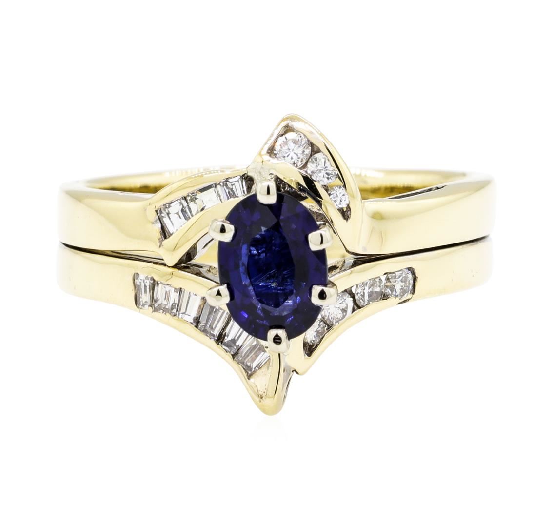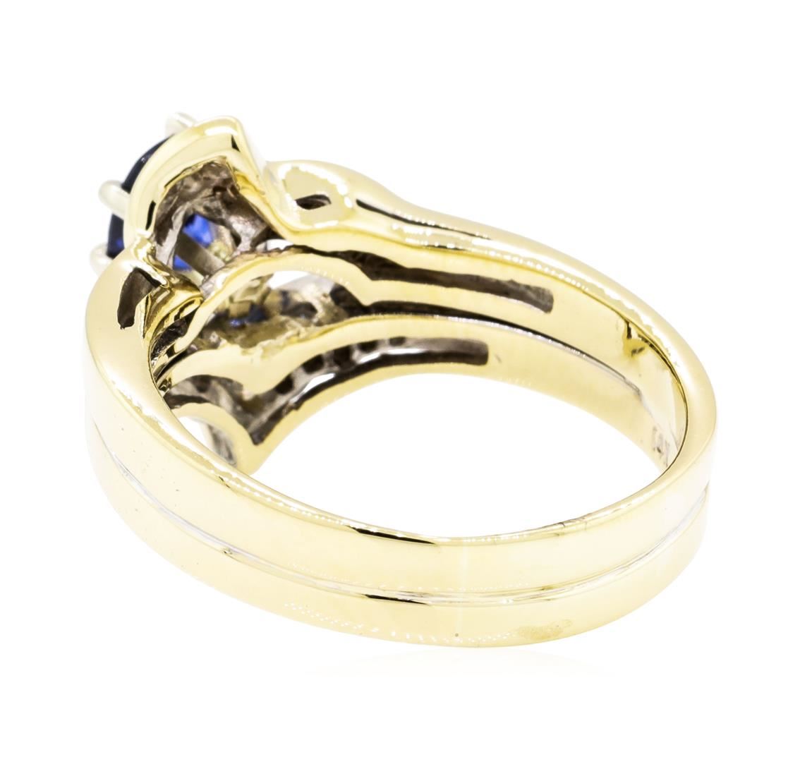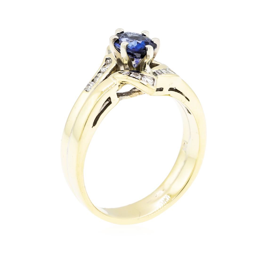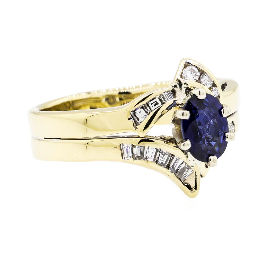 One ring featuring: 14KT yellow gold weighing 6.8 grams containing one sapphire weighing 1.01ct and round and baguette diamonds weighing 0.50ctw. The ring is a size 8.5.
