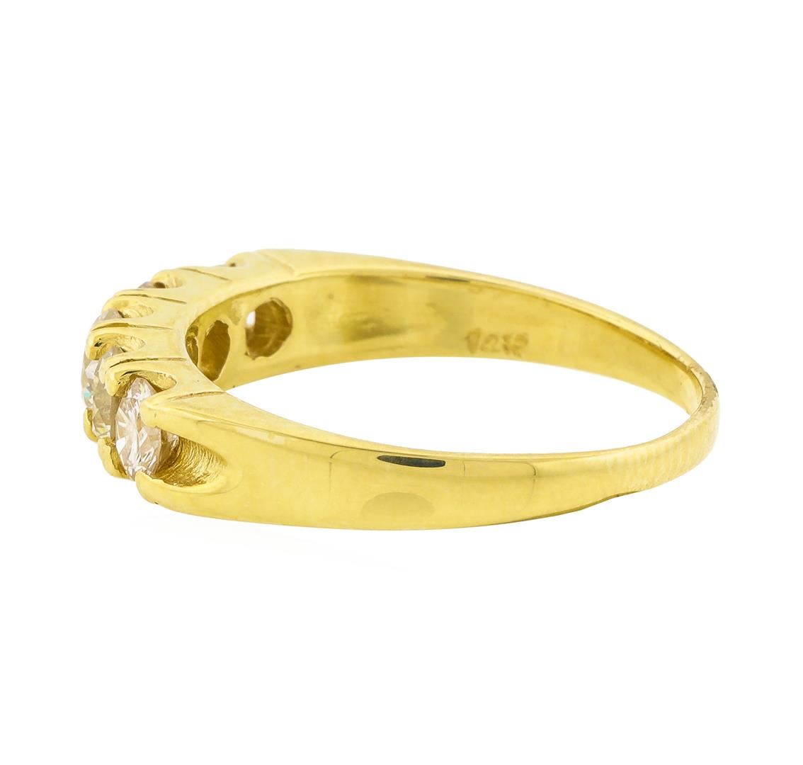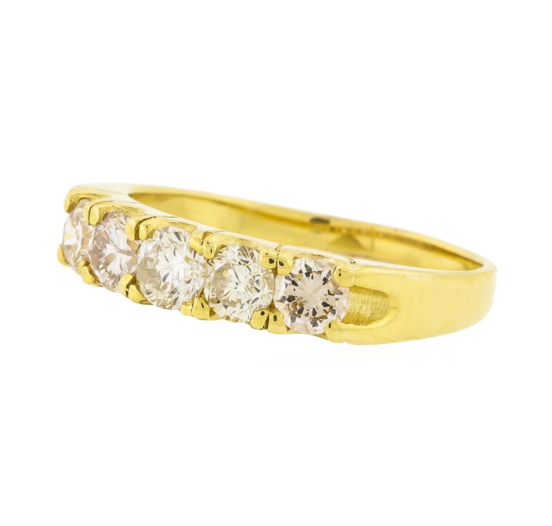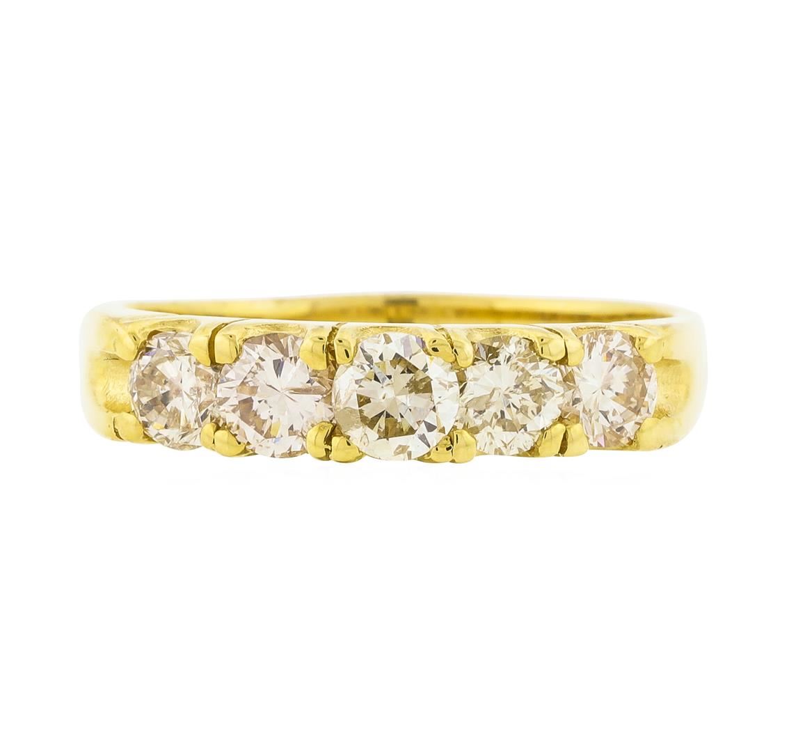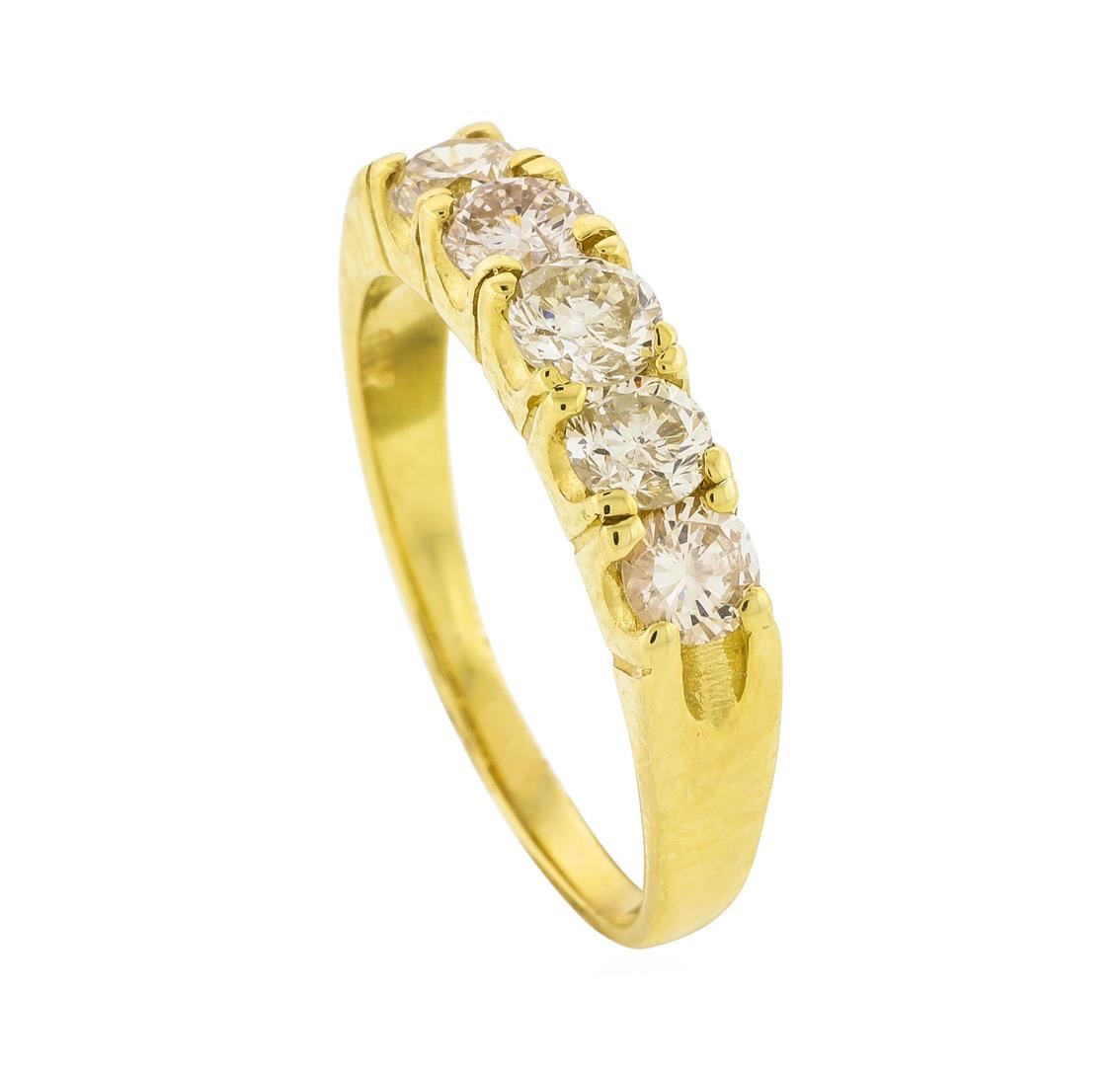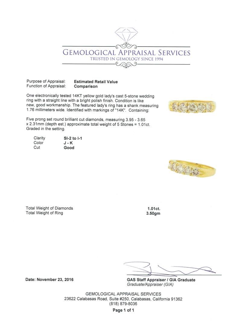 One electronically tested 14KT yellow gold lady's cast 5-stone wedding ring with a straight line with a bright polish finish. The featured lady's ring has a shank measuring 1.76 millimeters wide. Identified with markings of "14K". Condition is like new, good workmanship. Containing: Five prong set round brilliant cut diamonds, measuring 3.95 - 3.65 x 2.31mm (depth est.) approximate total weight of 5 Stones = 1.01ct. Graded in the setting. Clarity: SI-2 to I-1. Color: J - KCut Good. Total Weight of Diamonds 1.01ct. Total Weight of Ring 3.50gm. GAS Appraised.