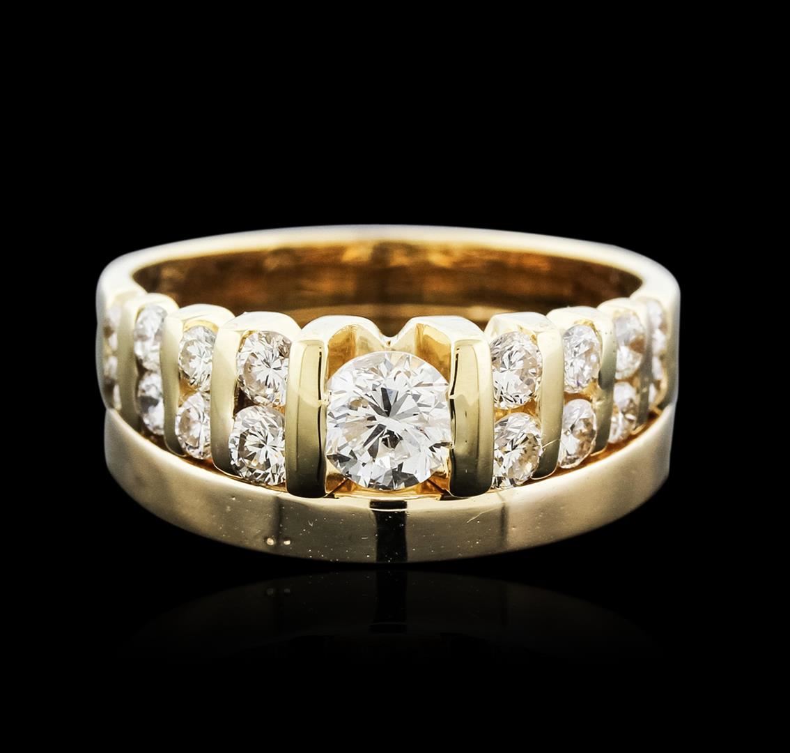 One ring featuring: 14KT yellow gold weighing 7.31 grams containing one round diamond center weighing 0.36ct and sixteen round cut diamonds weighing a total of 0.66ct.