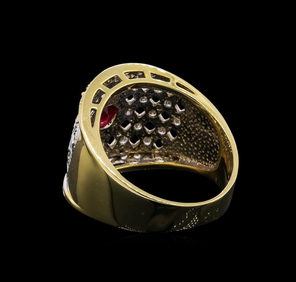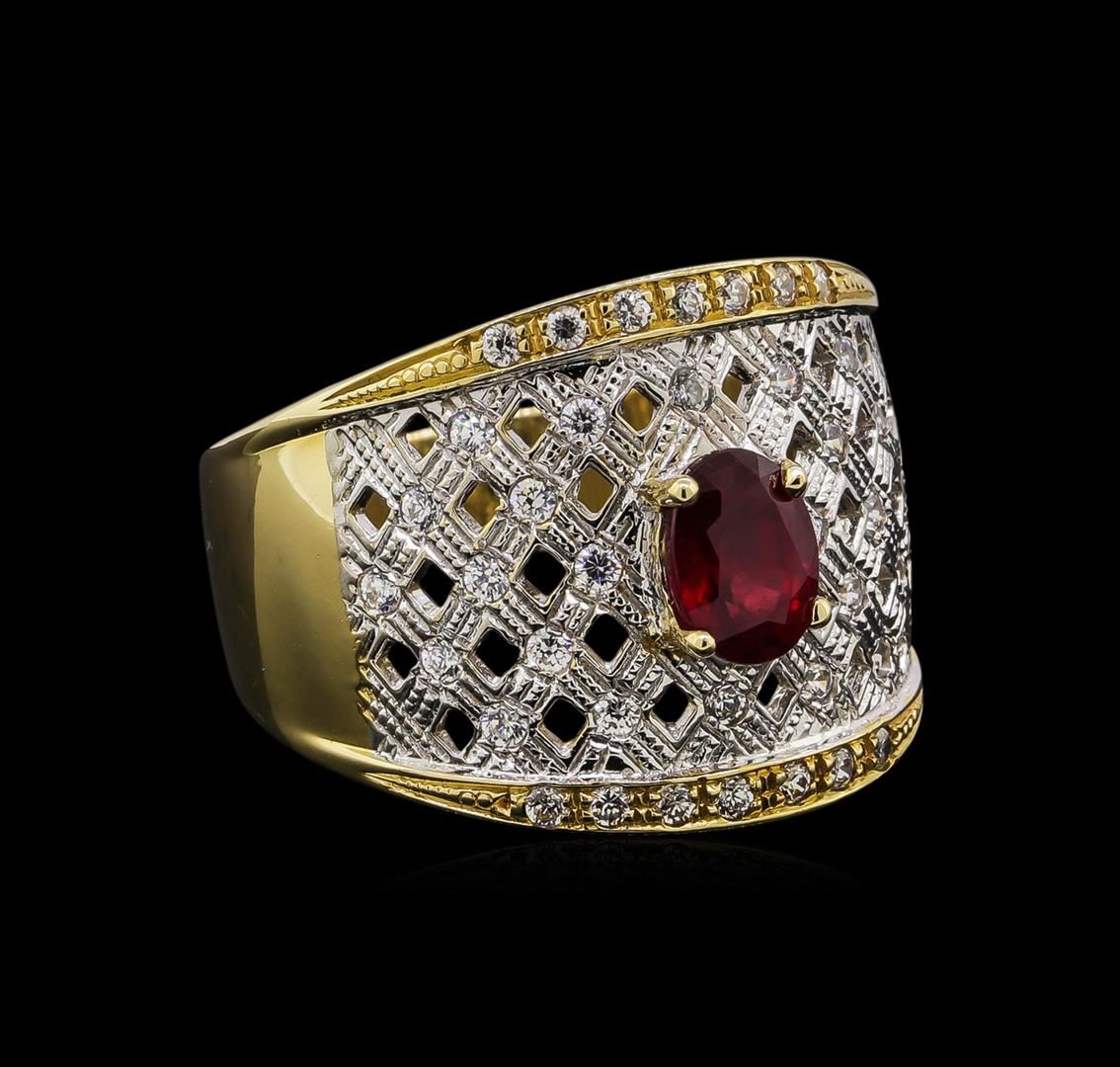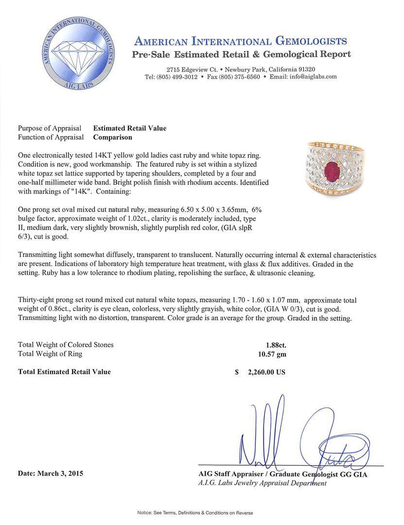One electronically tested 14KT yellow gold ladies cast ruby and white topaz ring. The featured ruby is set within a stylized white topaz set lattice supported by tapering shoulders, completed by a four and one-half millimeter wide band. Bright polish finish with rhodium accents. Identified with markings of "14K". Condition is new, good workmanship. Containing: One prong set oval mixed cut natural ruby, measuring 6.50 x 5.00 x 3.65mm, 6% bulge factor, approximate weight of 1.02ct., clarity is moderately included, type II, medium dark, very slightly brownish, slightly purplish red color, (GIA slpR 6/3), cut is good. Transmitting light somewhat diffusely, transparent to translucent. Naturally occurring internal & external characteristics are present. Indications of laboratory high temperature heat treatment, with glass & flux additives. Graded in the setting. Ruby has a low tolerance to rhodium plating, repolishing the surface, & ultrasonic cleaning. Thirty-eight prong set round mixed cut natural white topaz's, measuring 1.70 - 1.60 x 1.07 mm, approximate total weight of 0.86ct., clarity is eye clean, colorless, very slightly grayish, white color, (GIA W 0/3), cut is good. Transmitting light with no distortion, transparent. Color grade is an average for the group. Graded in the setting. Total Weight of Colored Stones 1.88ct. Total Weight of Ring 10.57 grams. AIG Appraised at $2,260.00.