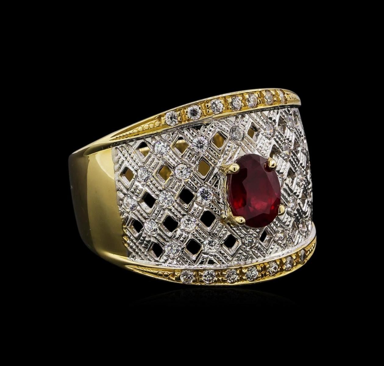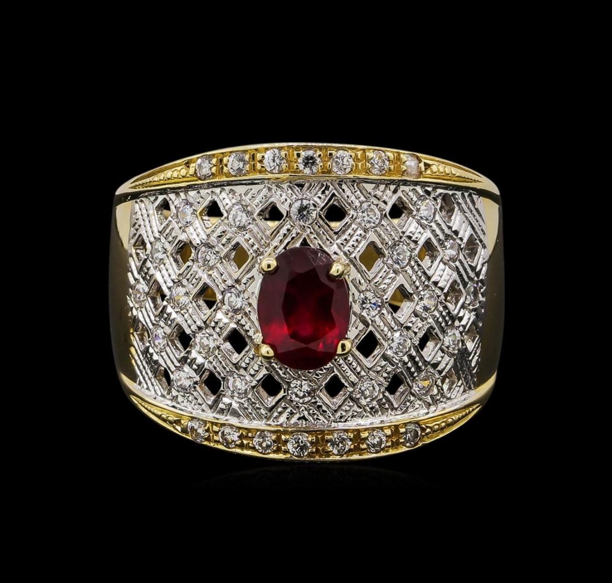 One electronically tested 14KT yellow gold ladies cast ruby and white topaz ring. The featured ruby is set within a stylized white topaz set lattice supported by tapering shoulders, completed by a four and one-half millimeter wide band. Bright polish finish with rhodium accents. Identified with markings of "14K". Condition is new, good workmanship. Containing: One prong set oval mixed cut natural ruby, measuring 6.50 x 5.00 x 3.65mm, 6% bulge factor, approximate weight of 1.02ct., clarity is moderately included, type II, medium dark, very slightly brownish, slightly purplish red color, (GIA slpR 6/3), cut is good. Transmitting light somewhat diffusely, transparent to translucent. Naturally occurring internal & external characteristics are present. Indications of laboratory high temperature heat treatment, with glass & flux additives. Graded in the setting. Ruby has a low tolerance to rhodium plating, repolishing the surface, & ultrasonic cleaning. Thirty-eight prong set round mixed cut natural white topaz's, measuring 1.70 - 1.60 x 1.07 mm, approximate total weight of 0.86ct., clarity is eye clean, colorless, very slightly grayish, white color, (GIA W 0/3), cut is good. Transmitting light with no distortion, transparent. Color grade is an average for the group. Graded in the setting. Total Weight of Colored Stones 1.88ct. Total Weight of Ring 10.57 grams. AIG Appraised at $2,260.00.