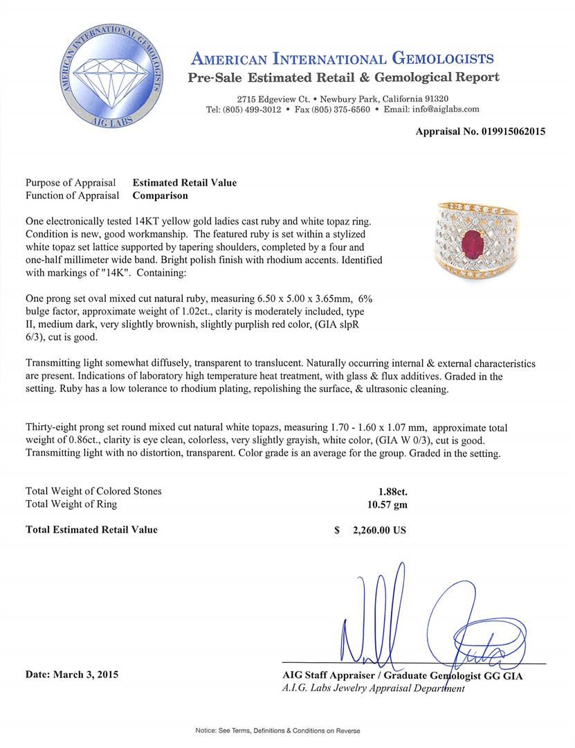 One electronically tested 14KT yellow gold ladies cast ruby and white topaz ring. The featured ruby is set within a stylized white topaz set lattice supported by tapering shoulders, completed by a four and one-half millimeter wide band. Bright polish finish with rhodium accents. Identified with markings of "14K". Condition is new, good workmanship. Containing: One prong set oval mixed cut natural ruby, measuring 6.50 x 5.00 x 3.65mm, 6% bulge factor, approximate weight of 1.02ct., clarity is moderately included, type II, medium dark, very slightly brownish, slightly purplish red color, (GIA slpR 6/3), cut is good. Transmitting light somewhat diffusely, transparent to translucent. Naturally occurring internal & external characteristics are present. Indications of laboratory high temperature heat treatment, with glass & flux additives. Graded in the setting. Ruby has a low tolerance to rhodium plating, repolishing the surface, & ultrasonic cleaning. Thirty-eight prong set round mixed cut natural white topaz's, measuring 1.70 - 1.60 x 1.07 mm, approximate total weight of 0.86ct., clarity is eye clean, colorless, very slightly grayish, white color, (GIA W 0/3), cut is good. Transmitting light with no distortion, transparent. Color grade is an average for the group. Graded in the setting. Total Weight of Colored Stones 1.88ct. Total Weight of Ring 10.57 grams. AIG Appraised at $2,260.00.
