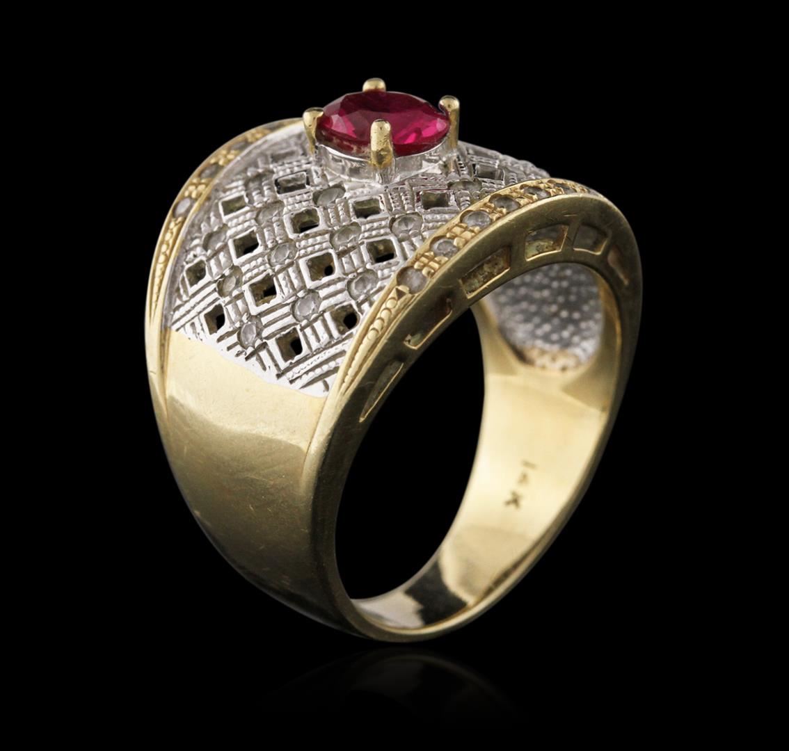 One electronically tested 14KT yellow gold ladies cast ruby and white topaz ring. The featured ruby is set within a stylized white topaz set lattice supported by tapering shoulders, completed by a four and one-half millimeter wide band. Bright polish finish with rhodium accents. Identified with markings of "14K". Condition is new, good workmanship. Containing: One prong set oval mixed cut natural ruby, measuring 6.50 x 5.00 x 3.65mm, 6% bulge factor, approximate weight of 1.02ct., clarity is moderately included, type II, medium dark, very slightly brownish, slightly purplish red color, (GIA slpR 6/3), cut is good. Transmitting light somewhat diffusely, transparent to translucent. Naturally occurring internal & external characteristics are present. Indications of laboratory high temperature heat treatment, with glass & flux additives. Graded in the setting. Ruby has a low tolerance to rhodium plating, repolishing the surface, & ultrasonic cleaning. Thirty-eight prong set round mixed cut natural white topaz's, measuring 1.70 - 1.60 x 1.07 mm, approximate total weight of 0.86ct., clarity is eye clean, colorless, very slightly grayish, white color, (GIA W 0/3), cut is good. Transmitting light with no distortion, transparent. Color grade is an average for the group. Graded in the setting. Total Weight of Colored Stones 1.88ct. Total Weight of Ring 10.57 grams. AIG Appraised at $2,260.00.