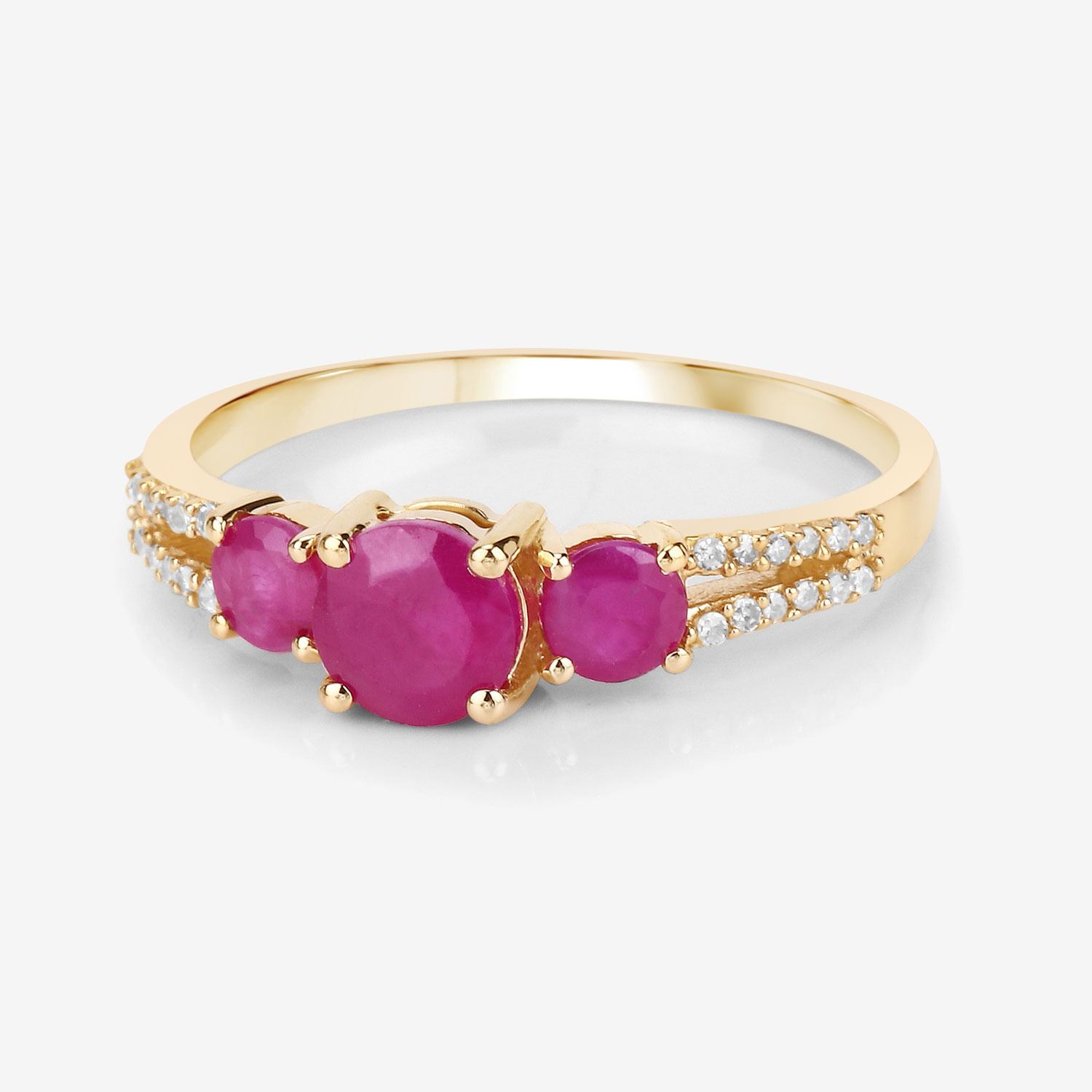 Ruby Round/5.00mm - 1/0.55 ctw Prong Setting Natural Heat Treated F + Ruby Round/3.50mm - 2/0.40 ctw Natural Heat Treated F + White Diamond Round/0.80mm - 24/0.07 ctw Natural Not Treated N H-I I1. Ring size 7. Total weight of 1.92 grams.