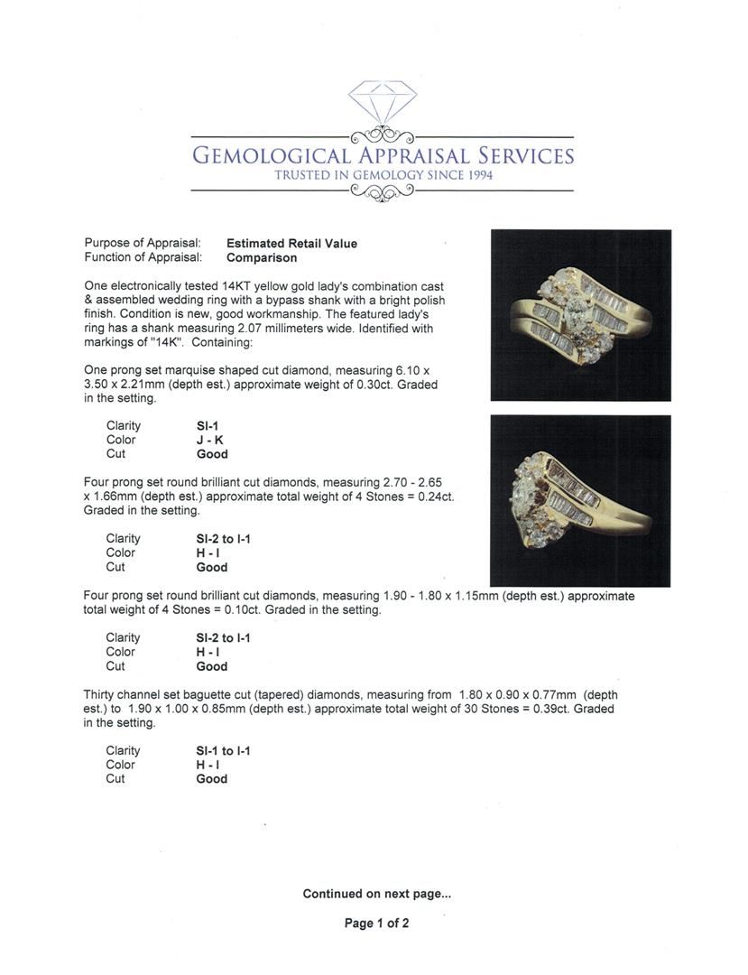One electronically tested 14KT yellow gold lady's combination cast & assembled wedding ring with a bypass shank with a bright polish finish. The featured lady's ring has a shank measuring 2.07 millimeters wide. Identified with markings of "14K". Condition is new, good workmanship. Containing: One prong set marquise shaped cut diamond, measuring 6.10 x 3.50 x 2.21mm (depth est.) approximate weight of 0.30ct. Graded in the setting. Color J - KClarity SI-1 Cut Good Four prong set round brilliant cut diamonds, measuring 2.70 - 2.65 x 1.66mm (depth est.) approximate total weight of 4 Stones = 0.24ct. Graded in the setting. Color H - I Clarity SI-2 to I-1 Cut Good Four prong set round brilliant cut diamonds, measuring 1.90 - 1.80 x 1.15mm (depth est.) approximate total weight of 4 Stones = 0.10ct. Graded in the setting. Color H - I Clarity SI-2 to I-1 Cut Good Thirty channel set baguette cut (tapered) diamonds, measuring from 1.80 x 0.90 x 0.77mm (depth est.) to 1.90 x 1.00 x 0.85mm (depth est.) approximate total weight of 30 Stones = 0.39ct. Graded in the setting. Color H - I Clarity SI-1 to I-1 Cut Good. Total Weight of Diamonds 1.03ct. Total Weight of Ring 5.50gm. GAS Appraised.