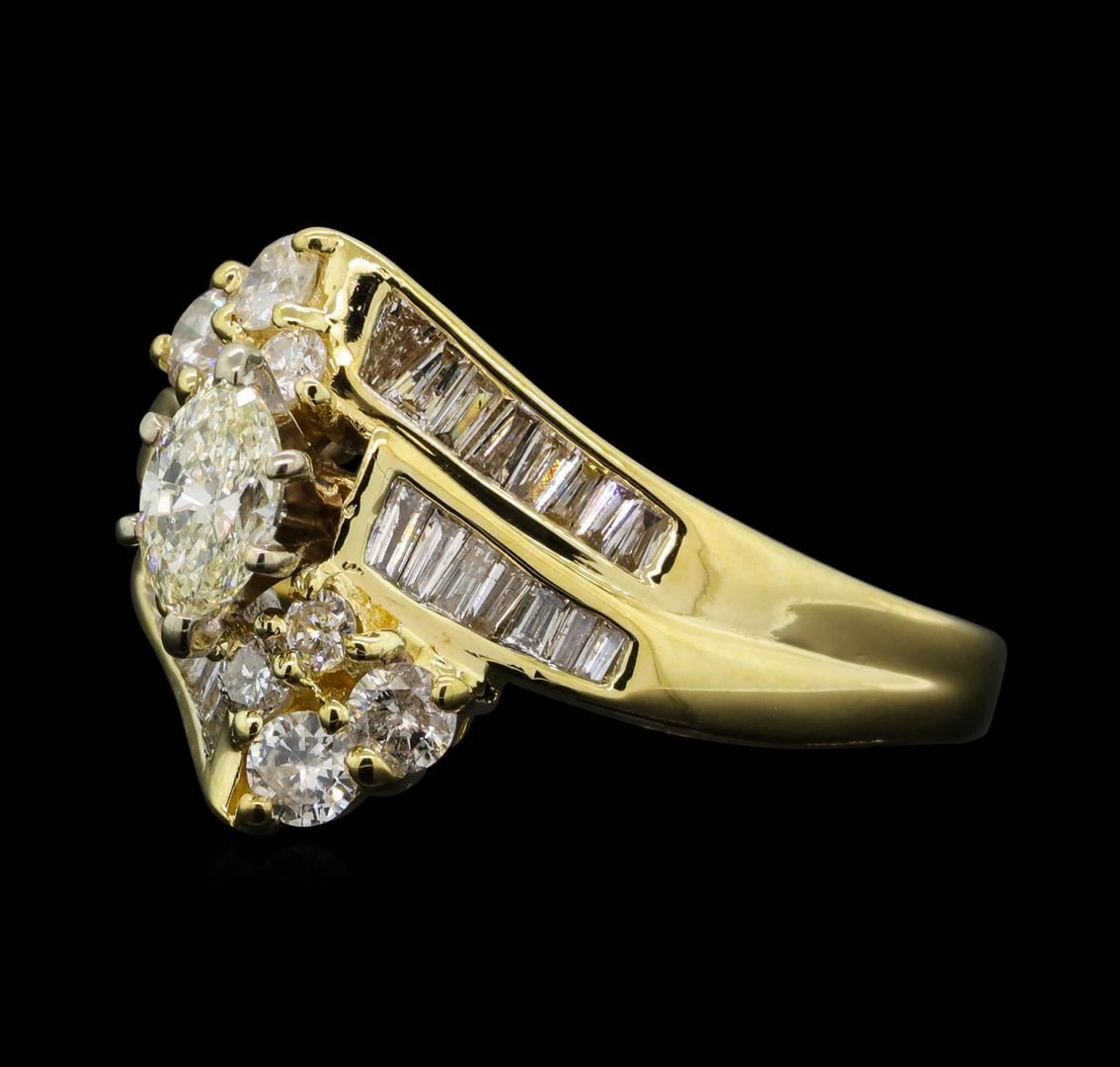 One electronically tested 14KT yellow gold lady's combination cast & assembled wedding ring with a bypass shank with a bright polish finish. The featured lady's ring has a shank measuring 2.07 millimeters wide. Identified with markings of "14K". Condition is new, good workmanship. Containing: One prong set marquise shaped cut diamond, measuring 6.10 x 3.50 x 2.21mm (depth est.) approximate weight of 0.30ct. Graded in the setting. Color J - KClarity SI-1 Cut Good Four prong set round brilliant cut diamonds, measuring 2.70 - 2.65 x 1.66mm (depth est.) approximate total weight of 4 Stones = 0.24ct. Graded in the setting. Color H - I Clarity SI-2 to I-1 Cut Good Four prong set round brilliant cut diamonds, measuring 1.90 - 1.80 x 1.15mm (depth est.) approximate total weight of 4 Stones = 0.10ct. Graded in the setting. Color H - I Clarity SI-2 to I-1 Cut Good Thirty channel set baguette cut (tapered) diamonds, measuring from 1.80 x 0.90 x 0.77mm (depth est.) to 1.90 x 1.00 x 0.85mm (depth est.) approximate total weight of 30 Stones = 0.39ct. Graded in the setting. Color H - I Clarity SI-1 to I-1 Cut Good. Total Weight of Diamonds 1.03ct. Total Weight of Ring 5.50gm. GAS Appraised.