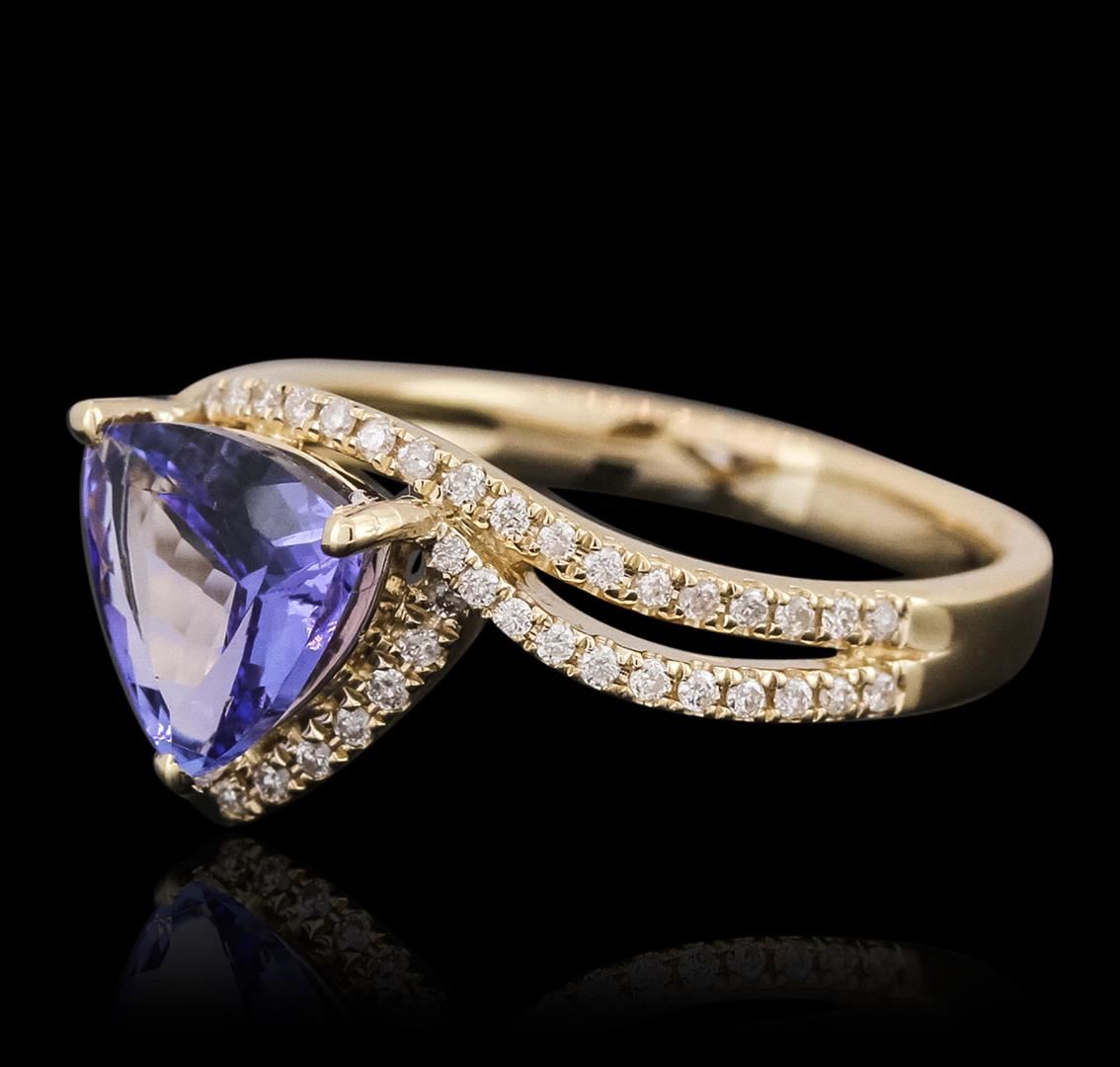 One electronically tested 14KT yellow gold ladies cast tanzanite and diamond ring with a bright polish finish. The featured tanzanite is set within a stylized diamond set bypass design, completed by a two and one-half millimeter wide band. Identified with markings of "14K". Condition is new, good workmanship. Containing: One prong set triangle mixed cut natural tanzanite, measuring 6.20 x 6.20 x 4.10mm, 8% bulge factor, approximate weight of 1.03ct., clarity is eye clean, type I, dark, very slightly grayish, violetish blue color, (GIA vB 7/3), cut is good. Transmitting light with no distortion, transparent. Graded in the setting. Tanzanite is a very rare gemstone that is only found in the country of Tanzania. Originally discovered in 1967. Tiffany & Company, named the stone Tanzanite. It is found in the Usumburu Mountains that border the Umba Valley of northern Tanzania. Tanzanite occurs in gray, brown, violet, blue, reddish-purple, & green. The gem is interesting because of its exceptional pleochroism. Rotated in different directions a tanzanite will exhibit multiple changes of color. Tanzanite has a low tolerance to ultrasonic cleaning, and should not be cleaned using this method. Sixty prong set round brilliant cut diamonds, measuring 1.10 - 1.00 x 0.63mm (depth est.) approximate total weight of 60 Stones = 0.35ct. Graded in the setting. Clarity: SI-2 to I-2. Color: G - I. Total Weight of Colored Stones 1.03ct. Total Weight of Diamonds 0.35ct. Total Weight of Ring 4.01 grams. AIG Appraised at $3,960.00.