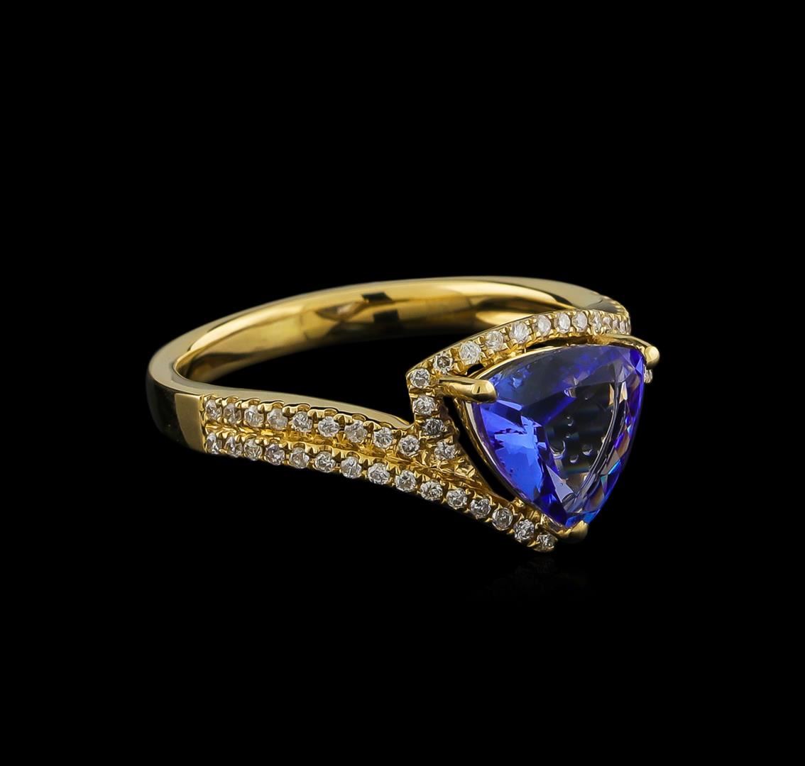 One electronically tested 14KT yellow gold ladies cast tanzanite and diamond ring with a bright polish finish. The featured tanzanite is set within a stylized diamond set bypass design, completed by a two and one-half millimeter wide band. Identified with markings of "14K". Condition is new, good workmanship. Containing: One prong set triangle mixed cut natural tanzanite, measuring 6.20 x 6.20 x 4.10mm, 8% bulge factor, approximate weight of 1.03ct., clarity is eye clean, type I, dark, very slightly grayish, violetish blue color, (GIA vB 7/3), cut is good. Transmitting light with no distortion, transparent. Graded in the setting. Tanzanite is a very rare gemstone that is only found in the country of Tanzania. Originally discovered in 1967. Tiffany & Company, named the stone Tanzanite. It is found in the Usumburu Mountains that border the Umba Valley of northern Tanzania. Tanzanite occurs in gray, brown, violet, blue, reddish-purple, & green. The gem is interesting because of its exceptional pleochroism. Rotated in different directions a tanzanite will exhibit multiple changes of color. Tanzanite has a low tolerance to ultrasonic cleaning, and should not be cleaned using this method. Sixty prong set round brilliant cut diamonds, measuring 1.10 - 1.00 x 0.63mm (depth est.) approximate total weight of 60 Stones = 0.35ct. Graded in the setting. Clarity: SI-2 to I-2. Color: G - I. Total Weight of Colored Stones 1.03ct. Total Weight of Diamonds 0.35ct. Total Weight of Ring 4.01 grams. AIG Appraised at $3,960.00.
