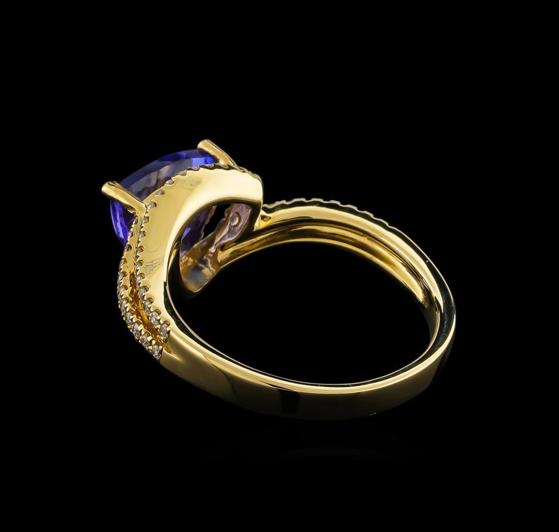 One electronically tested 14KT yellow gold ladies cast tanzanite and diamond ring with a bright polish finish. The featured tanzanite is set within a stylized diamond set bypass design, completed by a two and one-half millimeter wide band. Identified with markings of "14K". Condition is new, good workmanship. Containing: One prong set triangle mixed cut natural tanzanite, measuring 6.20 x 6.20 x 4.10mm, 8% bulge factor, approximate weight of 1.03ct., clarity is eye clean, type I, dark, very slightly grayish, violetish blue color, (GIA vB 7/3), cut is good. Transmitting light with no distortion, transparent. Graded in the setting. Tanzanite is a very rare gemstone that is only found in the country of Tanzania. Originally discovered in 1967. Tiffany & Company, named the stone Tanzanite. It is found in the Usumburu Mountains that border the Umba Valley of northern Tanzania. Tanzanite occurs in gray, brown, violet, blue, reddish-purple, & green. The gem is interesting because of its exceptional pleochroism. Rotated in different directions a tanzanite will exhibit multiple changes of color. Tanzanite has a low tolerance to ultrasonic cleaning, and should not be cleaned using this method. Sixty prong set round brilliant cut diamonds, measuring 1.10 - 1.00 x 0.63mm (depth est.) approximate total weight of 60 Stones = 0.35ct. Graded in the setting. Clarity: SI-2 to I-2. Color: G - I. Total Weight of Colored Stones 1.03ct. Total Weight of Diamonds 0.35ct. Total Weight of Ring 4.01 grams. AIG Appraised at $3,960.00.