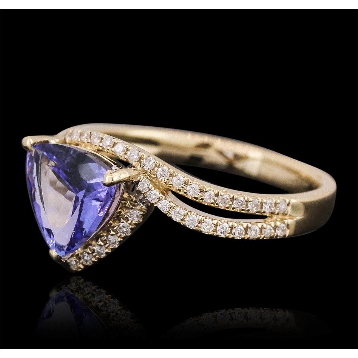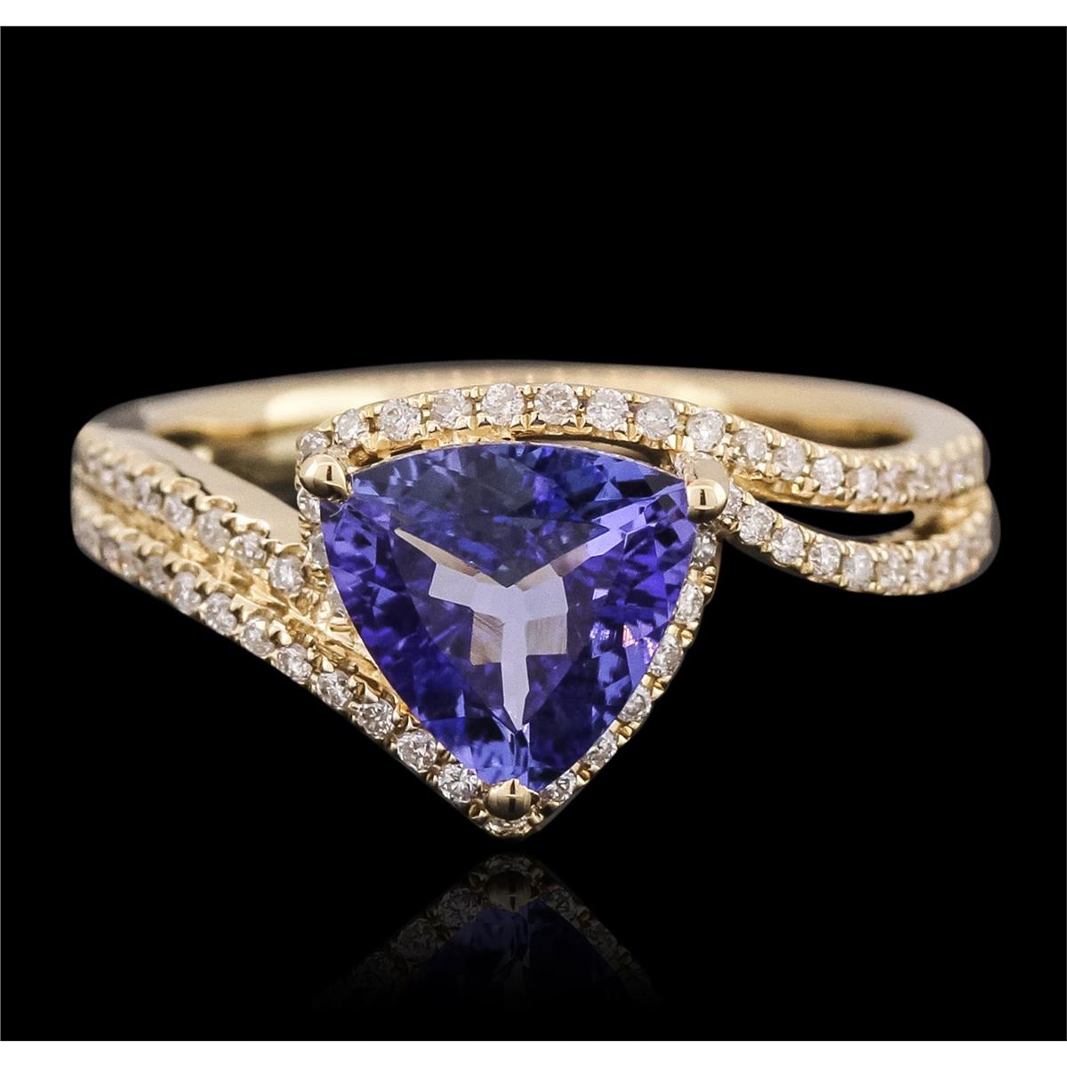 One electronically tested 14KT yellow gold ladies cast tanzanite and diamond ring with a bright polish finish. The featured tanzanite is set within a stylized diamond set bypass design, completed by a two and one-half millimeter wide band. Identified with markings of "14K". Condition is new, good workmanship. Containing: One prong set triangle mixed cut natural tanzanite, measuring 6.20 x 6.20 x 4.10mm, 8% bulge factor, approximate weight of 1.03ct., clarity is eye clean, type I, dark, very slightly grayish, violetish blue color, (GIA vB 7/3), cut is good. Transmitting light with no distortion, transparent. Graded in the setting. Tanzanite is a very rare gemstone that is only found in the country of Tanzania. Originally discovered in 1967. Tiffany & Company, named the stone Tanzanite. It is found in the Usumburu Mountains that border the Umba Valley of northern Tanzania. Tanzanite occurs in gray, brown, violet, blue, reddish-purple, & green. The gem is interesting because of its exceptional pleochroism. Rotated in different directions a tanzanite will exhibit multiple changes of color. Tanzanite has a low tolerance to ultrasonic cleaning, and should not be cleaned using this method. Sixty prong set round brilliant cut diamonds, measuring 1.10 - 1.00 x 0.63mm (depth est.) approximate total weight of 60 Stones = 0.35ct. Graded in the setting. Clarity: SI-2 to I-2. Color: G - I. Total Weight of Colored Stones 1.03ct. Total Weight of Diamonds 0.35ct. Total Weight of Ring 4.01 grams. AIG Appraised at $3,960.00.