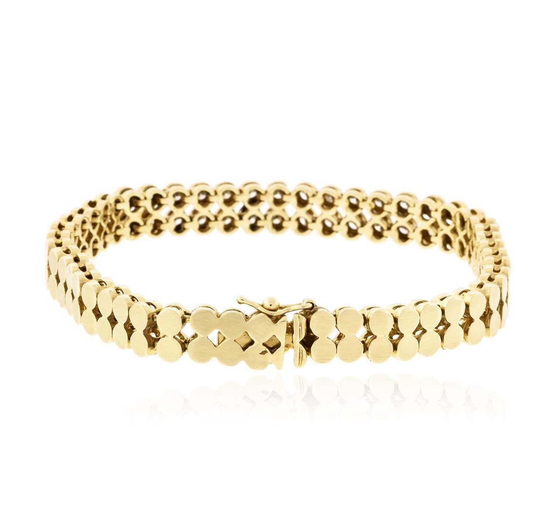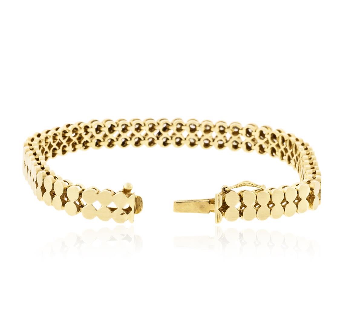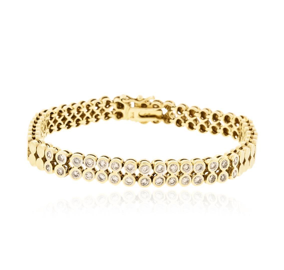 One electronically tested 14KT yellow gold ladies cast & assembled diamond bracelet with a bright polish finish. The seven inch wearable length bracelet features a double diamond set ribbon transitioning into matching yellow gold links, terminating in a concealed clasp with safety. Identified with markings of "14K". Condition is new, good workmanship. Containing: Thirty bezel set round brilliant cut diamonds, measuring 2.10 - 2.00 x 1.23mm (depth est.) approximate total weight of 30 Stones = 1.04ct. Graded in the setting. Clarity: SI-1 to I-1. Color: H - J. Total Weight of Diamonds 1.04ct. Total Weight of Bracelet 21.62 grams. AIG Appraised at $6,235.00.