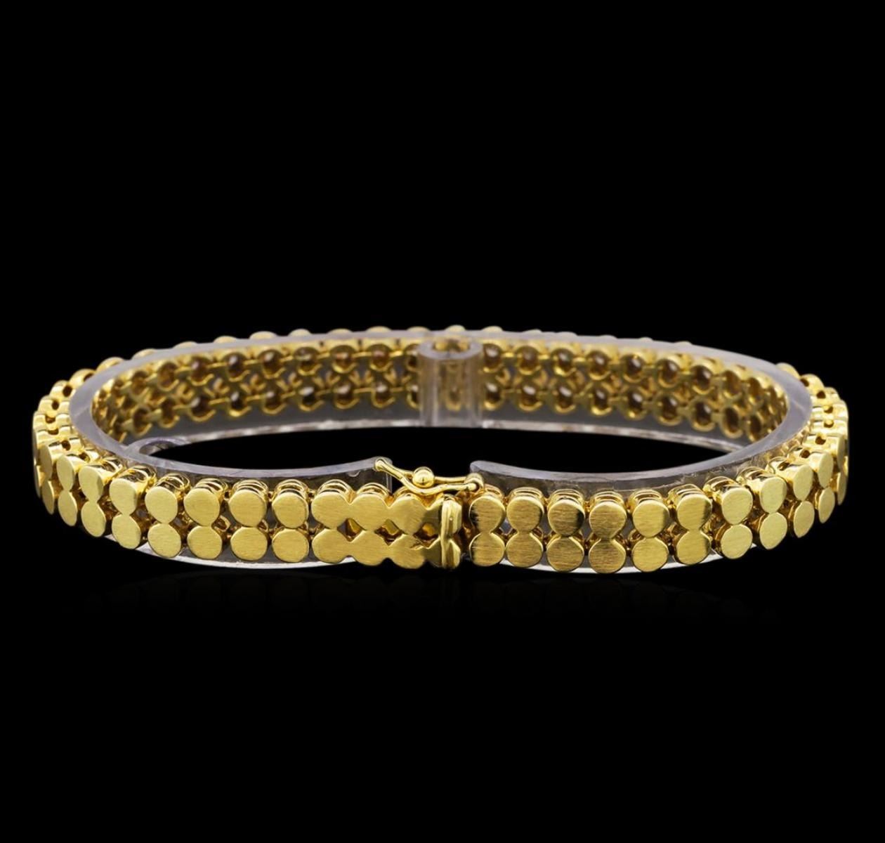 One electronically tested 14KT yellow gold ladies cast & assembled diamond bracelet with a bright polish finish. The seven inch wearable length bracelet features a double diamond set ribbon transitioning into matching yellow gold links, terminating in a concealed clasp with safety. Identified with markings of "14K". Condition is new, good workmanship. Containing: Thirty bezel set round brilliant cut diamonds, measuring 2.10 - 2.00 x 1.23mm (depth est.) approximate total weight of 30 Stones = 1.04ct. Graded in the setting. Clarity: SI-1 to I-1. Color: H - J. Total Weight of Diamonds 1.04ct. Total Weight of Bracelet 21.62 grams. AIG Appraised.