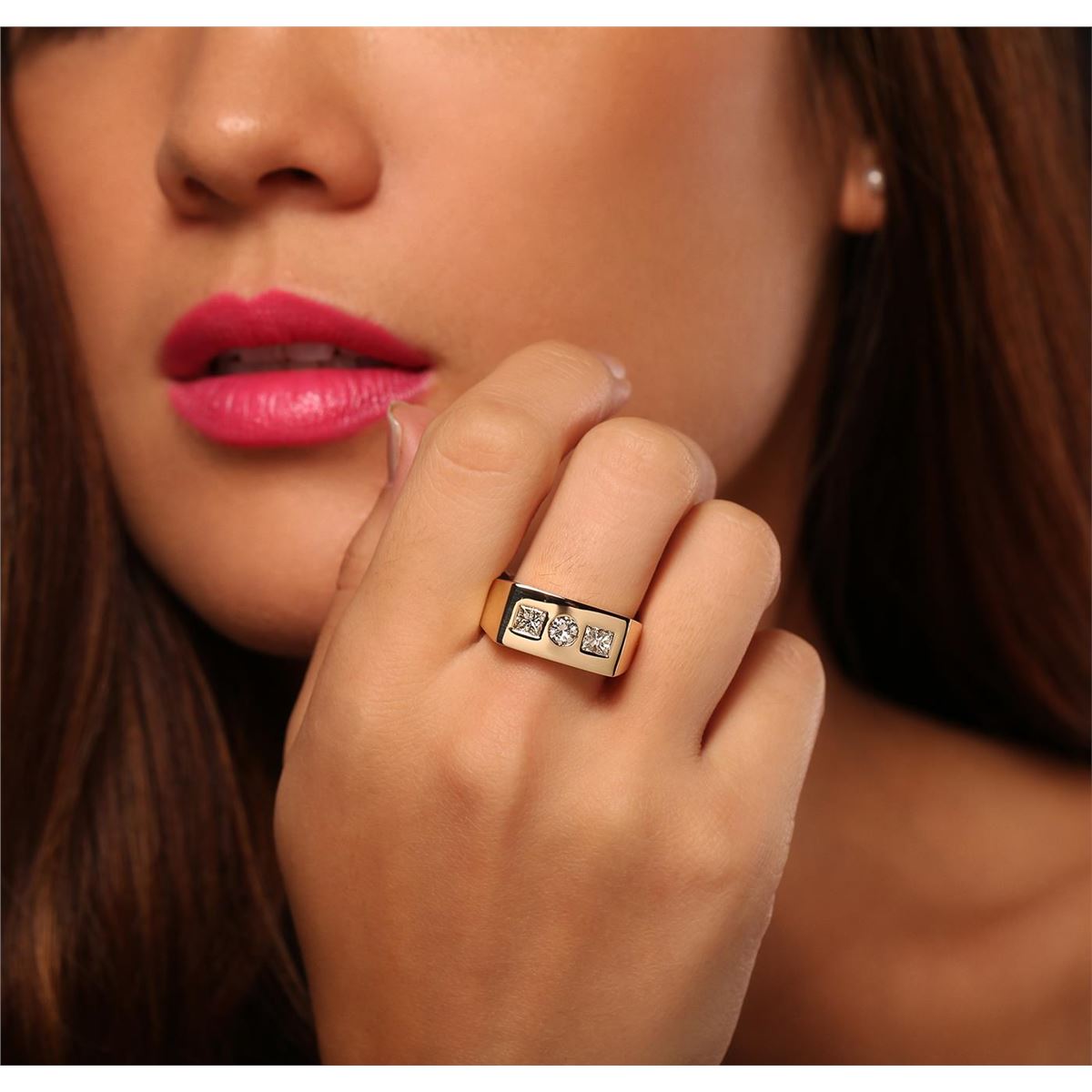 One electronically tested 14KT yellow gold Ladies combination cast & assembled ring with a bright polish finish. Condition is very good. Identified with markings of "14K". Containing: One gypsy set round brilliant cut diamond, measuring 4.30 - 3.80 x 2.43mm (depth est.) approximate weight of 0.25ct. Clarity: SI-2. Color: J, Cut is Good. Two gypsy set princess cut diamonds, measuring 4.00 x 4.00 x 3.00mm (depth est.) approximate. Total Weight of 2 Stones = 0.79ct. Clarity: VS-2 to SI-1. Color: J, Cut is Good. Total Weight of Diamonds 1.04ct. Total Weight of Ring 12.00gm. GGL Appraised at $8,620.00.