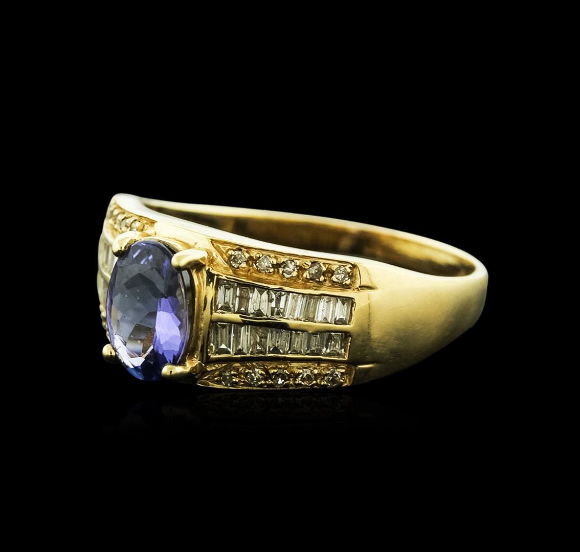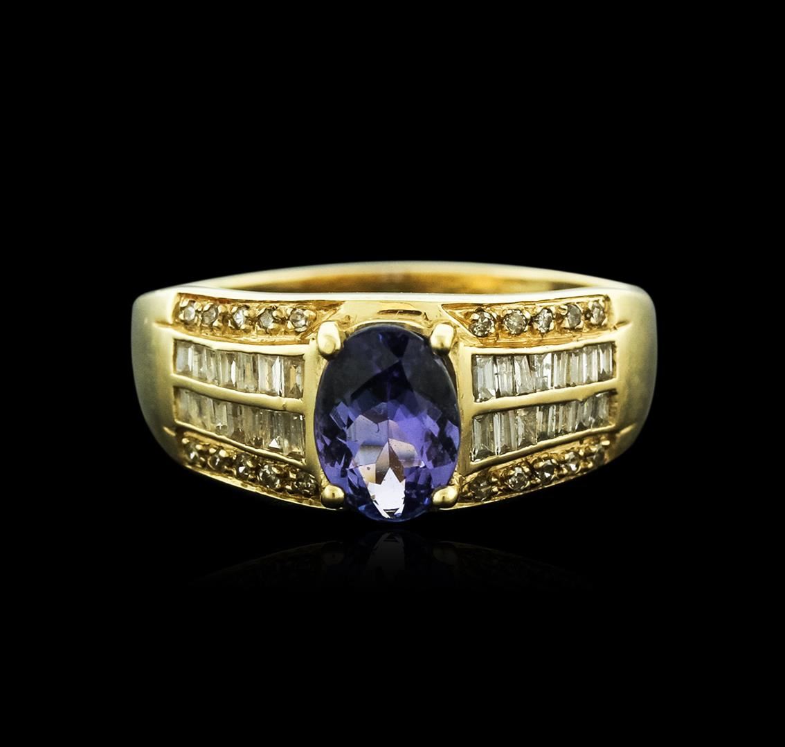 One electronically tested 14KT yellow gold ladies cast tanzanite and diamond ring with a bright polish finish. Identified with markings of "14K". Condition is new. Containing: One prong set oval modified brilliant cut natural tanzanite, measuring 7.50 x 5.50 x 3.58mm, approximate weight of 1.04ct., clarity is eye clean, type I, medium light, very slightly grayish, violet color, (GIA V 4/3), cut is good. Twenty prong set single cut diamonds, measuring 1.00 - 1.00 x 0.60mm (depth est.) approximate total weight of 20 Stones = 0.07ct. Clarity: I-1 to I-2. Color: I - J. Twenty-Eight channel set baguette cut diamonds, measuring 1.30 x 1.00 x 0.85mm (depth est.) approximate total weight of 28 Stones = 0.28ct. Clarity: I-1 to I-2. Color: I - J. Colored gemstones are presumed to have been subjected to commonly used enhancement processes. All diamonds and colored gemstones are graded in the mounting, unless otherwise stated. Total Weight of Colored Stones 1.04ct. Total Weight of Diamonds 0.36ct. Total Weight of Ring 3.00 grams. GGL Appraised at $1,620.00.