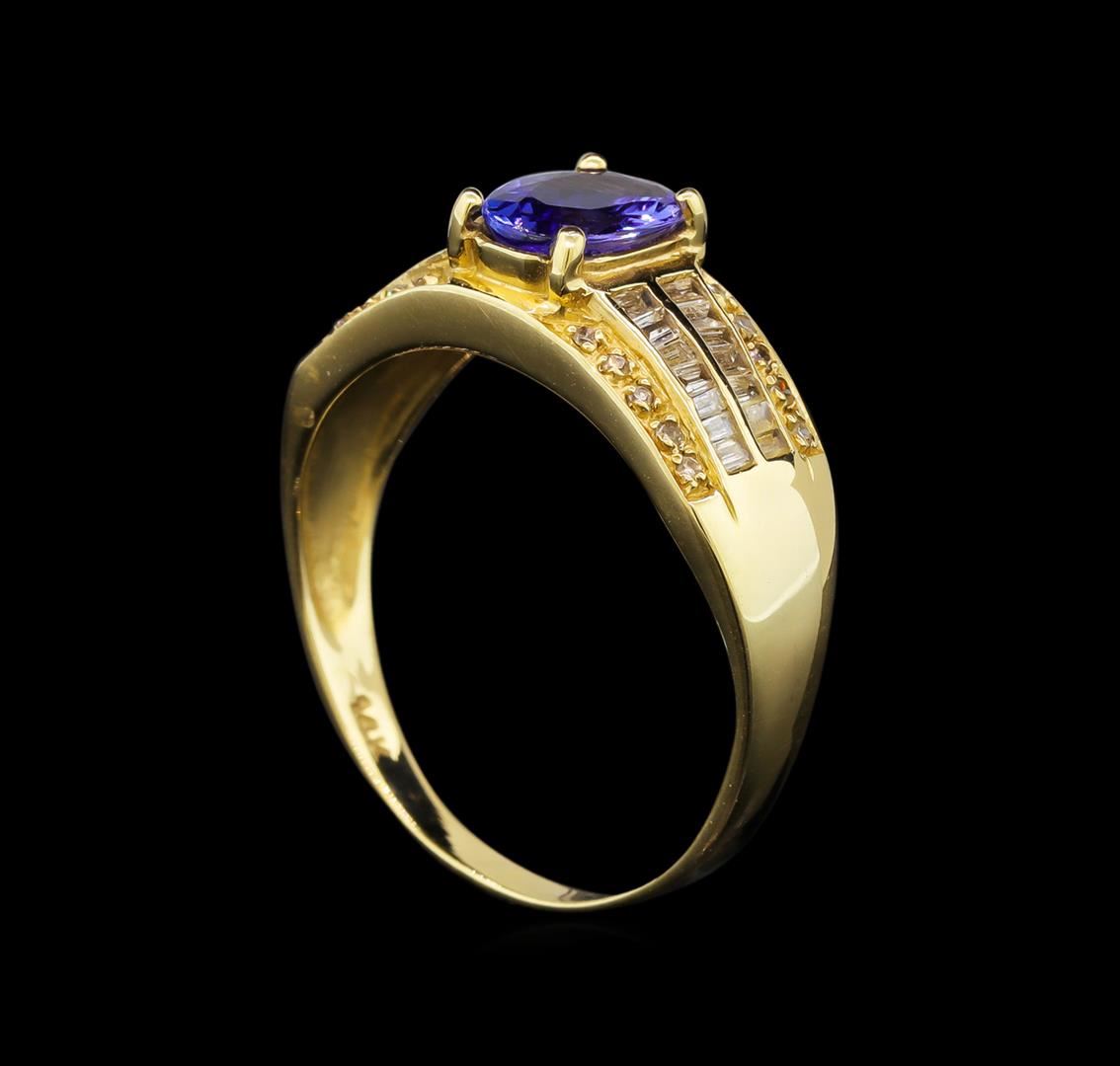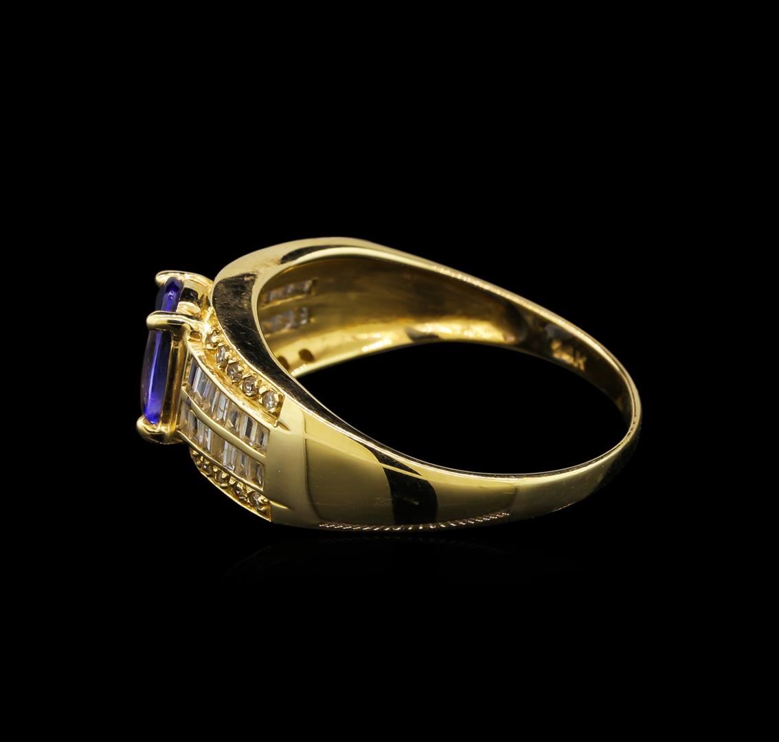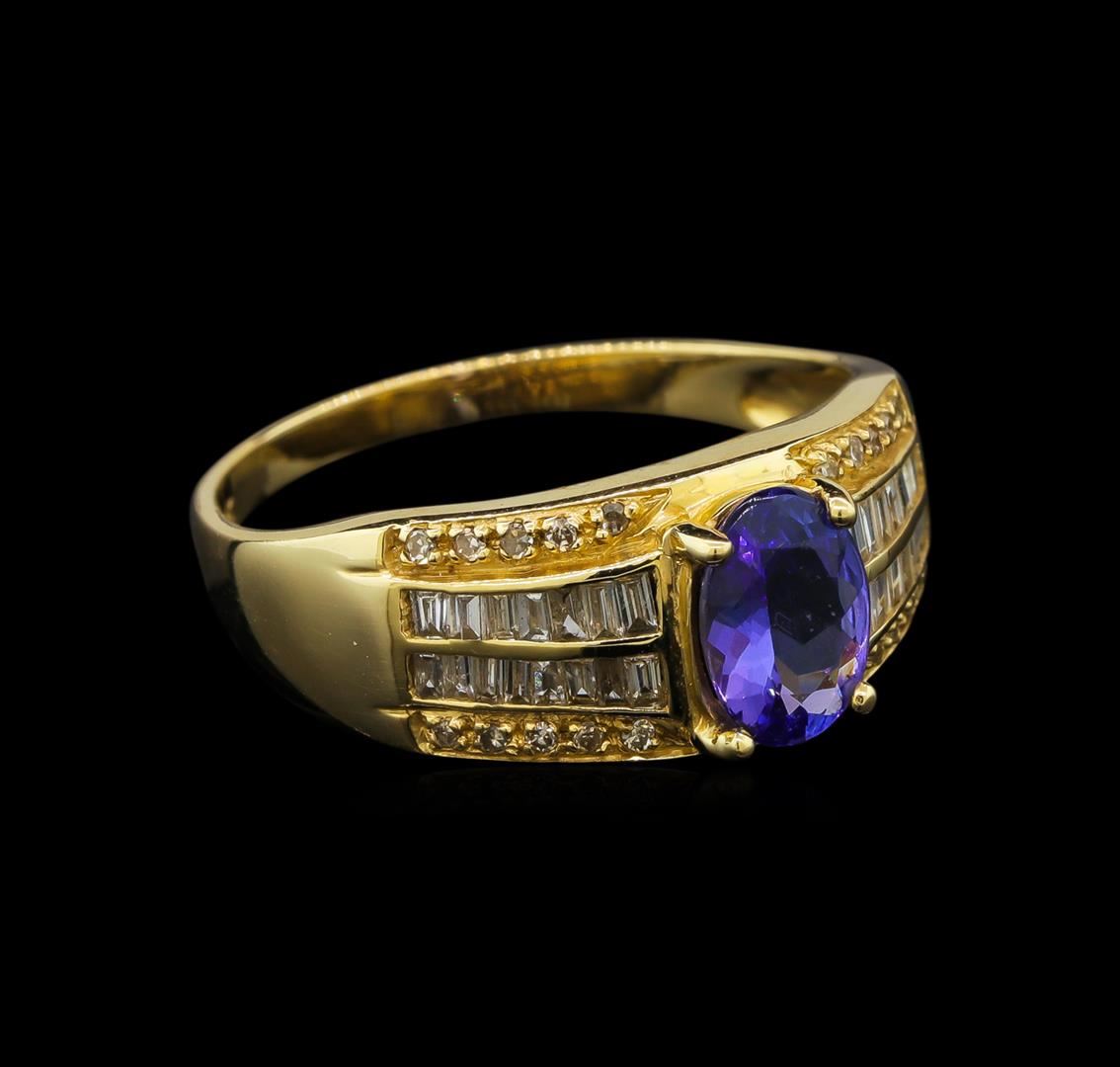 One electronically tested 14KT yellow gold ladies cast tanzanite and diamond ring with a bright polish finish. Identified with markings of "14K". Condition is new. Containing: One prong set oval modified brilliant cut natural tanzanite, measuring 7.50 x 5.50 x 3.58mm, approximate weight of 1.04ct., clarity is eye clean, type I, medium light, very slightly grayish, violet color, (GIA V 4/3), cut is good. Twenty prong set single cut diamonds, measuring 1.00 - 1.00 x 0.60mm (depth est.) approximate total weight of 20 Stones = 0.07ct. Clarity: I-1 to I-2. Color: I - J. Twenty-Eight channel set baguette cut diamonds, measuring 1.30 x 1.00 x 0.85mm (depth est.) approximate total weight of 28 Stones = 0.28ct. Clarity: I-1 to I-2. Color: I - J. Colored gemstones are presumed to have been subjected to commonly used enhancement processes. All diamonds and colored gemstones are graded in the mounting, unless otherwise stated. Total Weight of Colored Stones 1.04ct. Total Weight of Diamonds 0.36ct. Total Weight of Ring 3.00 grams. GGL Appraised at $1,620.00.