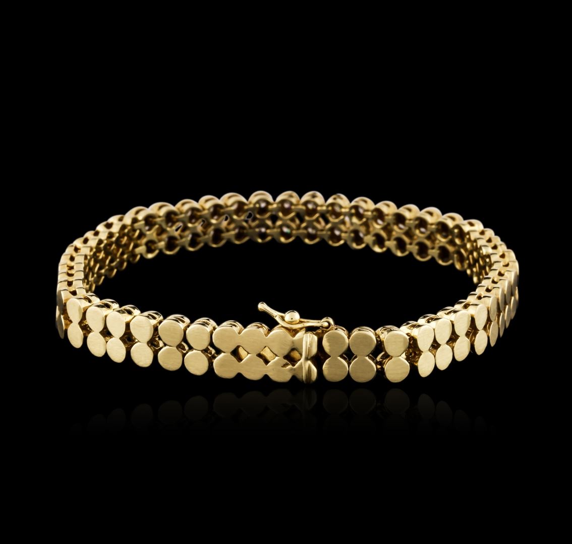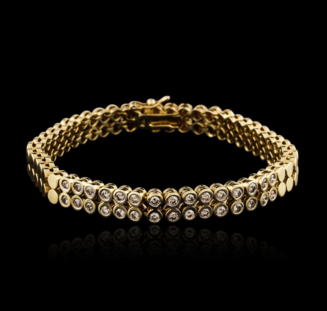 One electronically tested 14KT yellow gold ladies cast & assembled diamond bracelet with a bright polish finish. The seven inch wearable length bracelet features a double diamond set ribbon transitioning into matching yellow gold links, terminating in a concealed clasp with safety. Identified with markings of "14K". Condition is new, good workmanship. Containing: Thirty bezel set round brilliant cut diamonds, measuring 2.10 - 2.00 x 1.23mm (depth est.) approximate total weight of 30 Stones = 1.04ct. Graded in the setting. Clarity: SI-1 to I-1. Color: H - J. Total Weight of Diamonds 1.04ct. Total Weight of Bracelet 21.62 grams. AIG Appraised at $6,235.00.