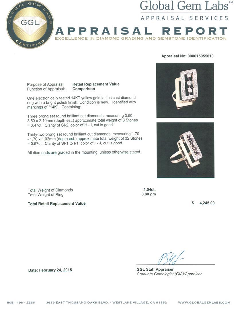 One electronically tested 14KT yellow gold ladies cast diamond ring with a bright polish finish. Identified with markings of "14K". Condition is new. Containing: Three prong set round brilliant cut diamonds, measuring 3.50 - 3.50 x 2.10mm (depth est.) approximate total weight of 3 Stones = 0.47ct. Clarity: SI-2. Color: H - I, Cut is Good. Thirty-Two prong set round brilliant cut diamonds, measuring 1.70 - 1.70 x 1.02mm (depth est.) approximate total weight of 32 Stones = 0.57ct. Clarity: SI-1 to I-1. Color: I - J, Cut is Good. All diamonds are graded in the mounting, unless otherwise stated. Total Weight of Diamonds 1.04ct. Total Weight of Ring 8.80 grams. GGL Appraised at $4,245.00.