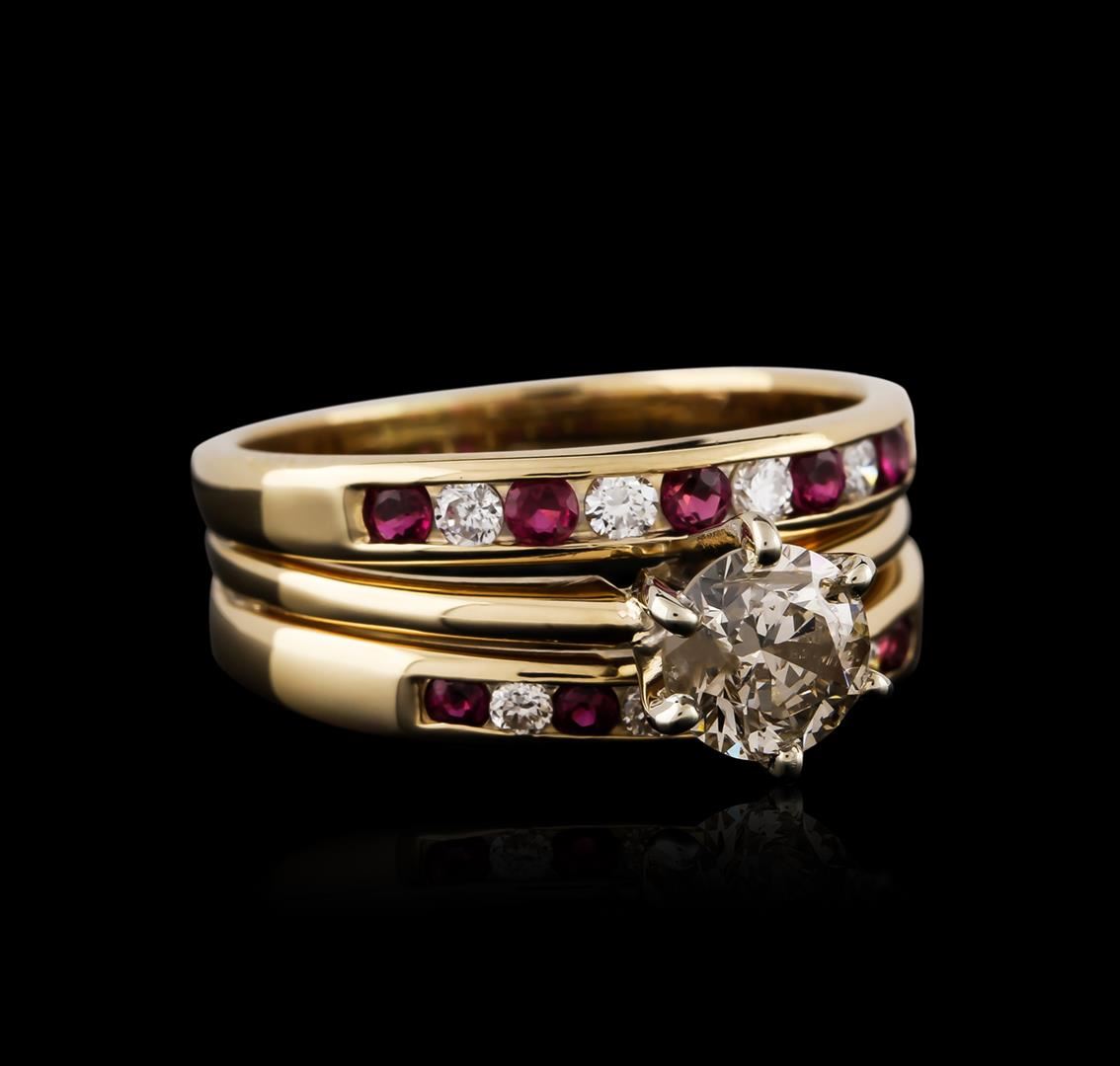 One electronically tested 14KT yellow gold ladies cast diamond and ruby engagement ring with a bright polish finish. Identified with markings of "14K". Condition is new. Containing: One prong set round brilliant cut diamond, measuring 6.29 - 6.29 x 3.77mm (depth est.) approximate weight of 0.91ct. Clarity: I-1. Color: M, Cut is Good. Eight channel set round brilliant cut diamonds, measuring 1.80 - 1.80 x 1.08mm (depth est.) approximate total weight of 8 Stones = 0.17ct. Clarity: SI-1. Color: J - K, Cut is Good. Ten channel set round modified brilliant cut natural rubies, measuring 2.00. - 2.00. x 1.30 mm, approximate total weight of 0.40ct., clarity is slightly included, medium light, moderately strong, reddish purple color, (GIA rP 4/4), cut is good. Colored gemstones are presumed to have been subjected to commonly used enhancement processes. All diamonds and colored gemstones are graded in the mounting, unless otherwise stated. Total Weight of Colored Stones 0.40ct. Total Weight of Diamonds 1.08ct. Total Weight of Engagement Ring 6.90 grams. GGL Appraised at $4,975.00.