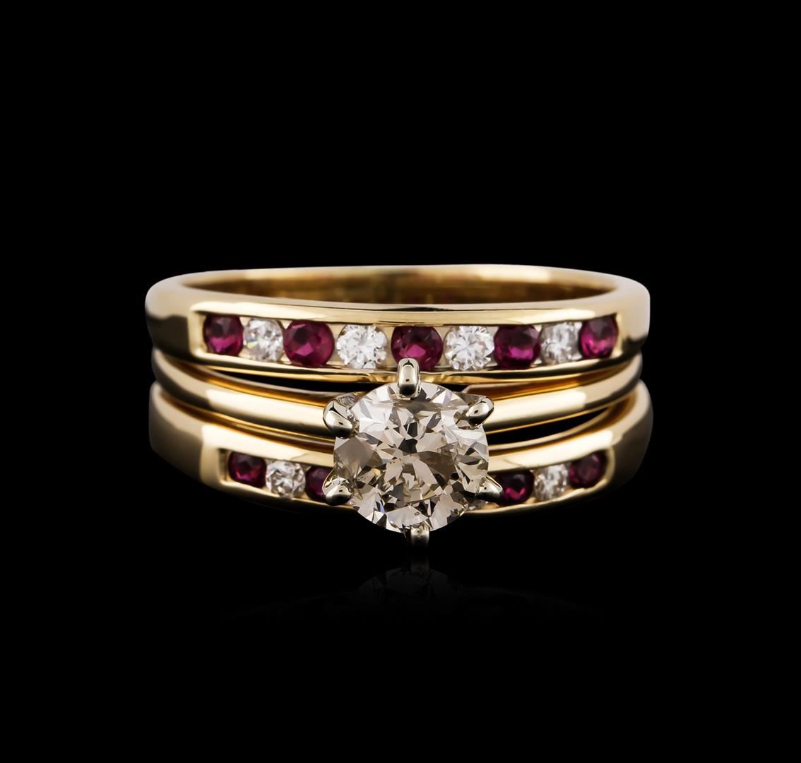 One electronically tested 14KT yellow gold ladies cast diamond and ruby engagement ring with a bright polish finish. Identified with markings of "14K". Condition is new. Containing: One prong set round brilliant cut diamond, measuring 6.29 - 6.29 x 3.77mm (depth est.) approximate weight of 0.91ct. Clarity: I-1. Color: M, Cut is Good. Eight channel set round brilliant cut diamonds, measuring 1.80 - 1.80 x 1.08mm (depth est.) approximate total weight of 8 Stones = 0.17ct. Clarity: SI-1. Color: J - K, Cut is Good. Ten channel set round modified brilliant cut natural rubies, measuring 2.00. - 2.00. x 1.30 mm, approximate total weight of 0.40ct., clarity is slightly included, medium light, moderately strong, reddish purple color, (GIA rP 4/4), cut is good. Colored gemstones are presumed to have been subjected to commonly used enhancement processes. All diamonds and colored gemstones are graded in the mounting, unless otherwise stated. Total Weight of Colored Stones 0.40ct. Total Weight of Diamonds 1.08ct. Total Weight of Engagement Ring 6.90 grams. GGL Appraised at $4,975.00.
