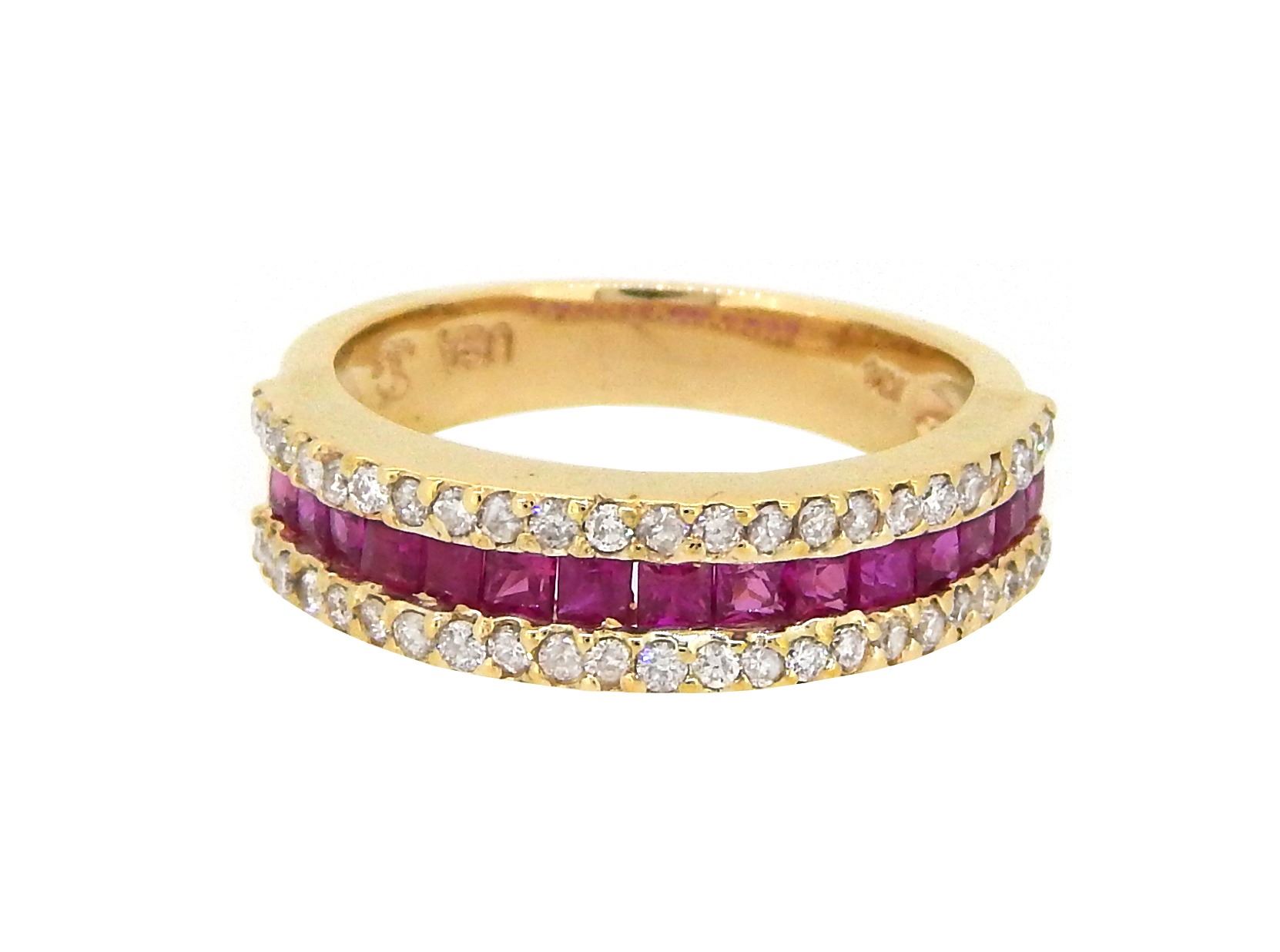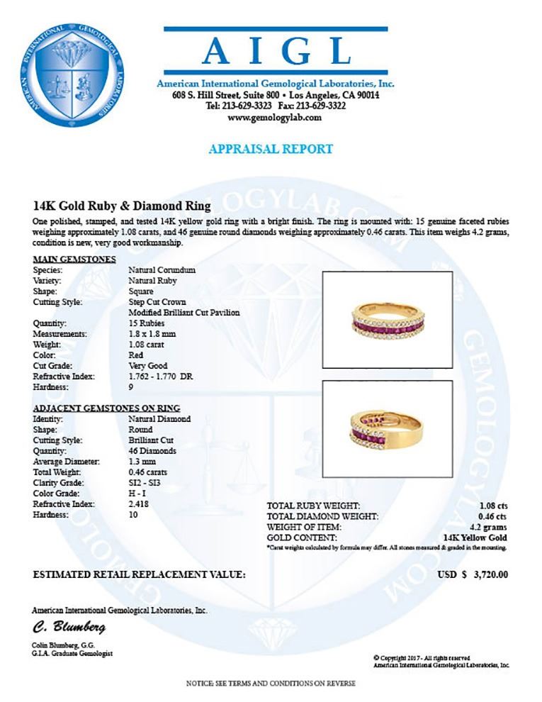 One 14KT Yellow Gold 1.08ctw Ruby and Diamond Ring. (15) Rubies with a total weight of 1.08cts. (46) Diamonds with a total weight of 0.46cts. Total weight of this ring is 4.2 grams.