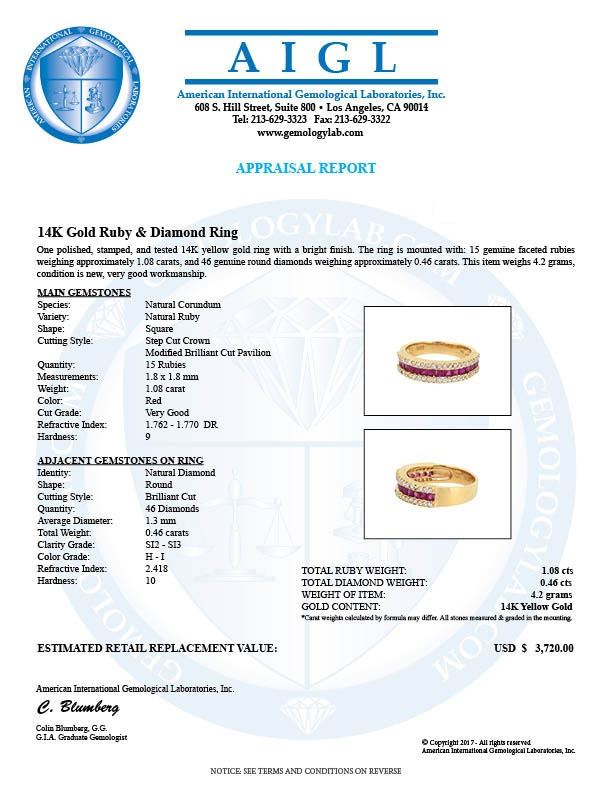 One 14KT Yellow Gold 1.08ctw Ruby and Diamond Ring. (15) Rubies with a total weight of 1.08cts. (46) diamonds with a total weight of 0.46cts. Total weight of this ring is 4.2 grams.