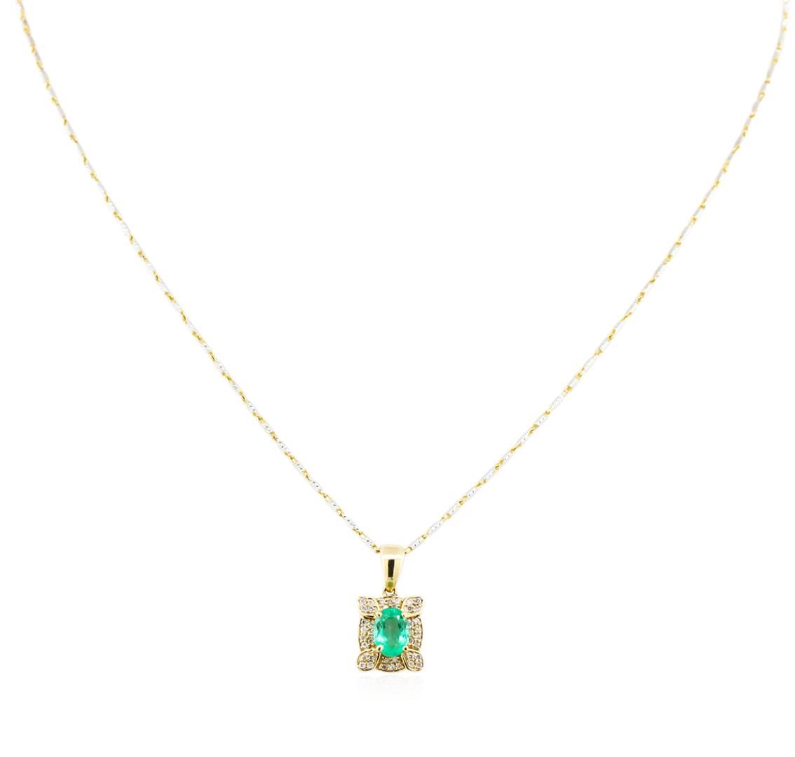 One electronically tested 14KT yellow gold ladies cast & assembled emerald and diamond pendant with chain. The pendant features an emerald set within a stylized diamond bezel, completed by a yellow gold bail. The pendant is supported by an eighteen inch length 14KT yellow gold designer style chain with rhodium accents, terminating in a lobster claw clasp. Bright polish finish Trademark is Orianne. Identified with markings of "14K". Condition is new, good workmanship. Containing: One prong set oval mixed cut natural emerald, measuring 7.60 x 5.50 x 4.00mm, 10%. bulge factor, approximate weight of 1.09ct., clarity is moderately included, type III, medium dark, very slightly grayish, very slightly bluish green color, (GIA vslbG 6/3), cut is good. Transmitting light with a minimum of distortion, transparent. Naturally occurring internal & external characteristics are present. Indications of oil residue.Graded in the setting.Forty prong set round brilliant cut diamonds approximate. Total Weight of 40 Stones = 0.19ct. Graded in the setting. Clarity: SI-2 to I-2. Color: G - I. Total Weight of Colored Stones 1.09ct. Total Weight of Diamonds 0.19ct. Total Weight of Pendant With Chain 6.01gm. AIG Appraised at $2,615.00.
