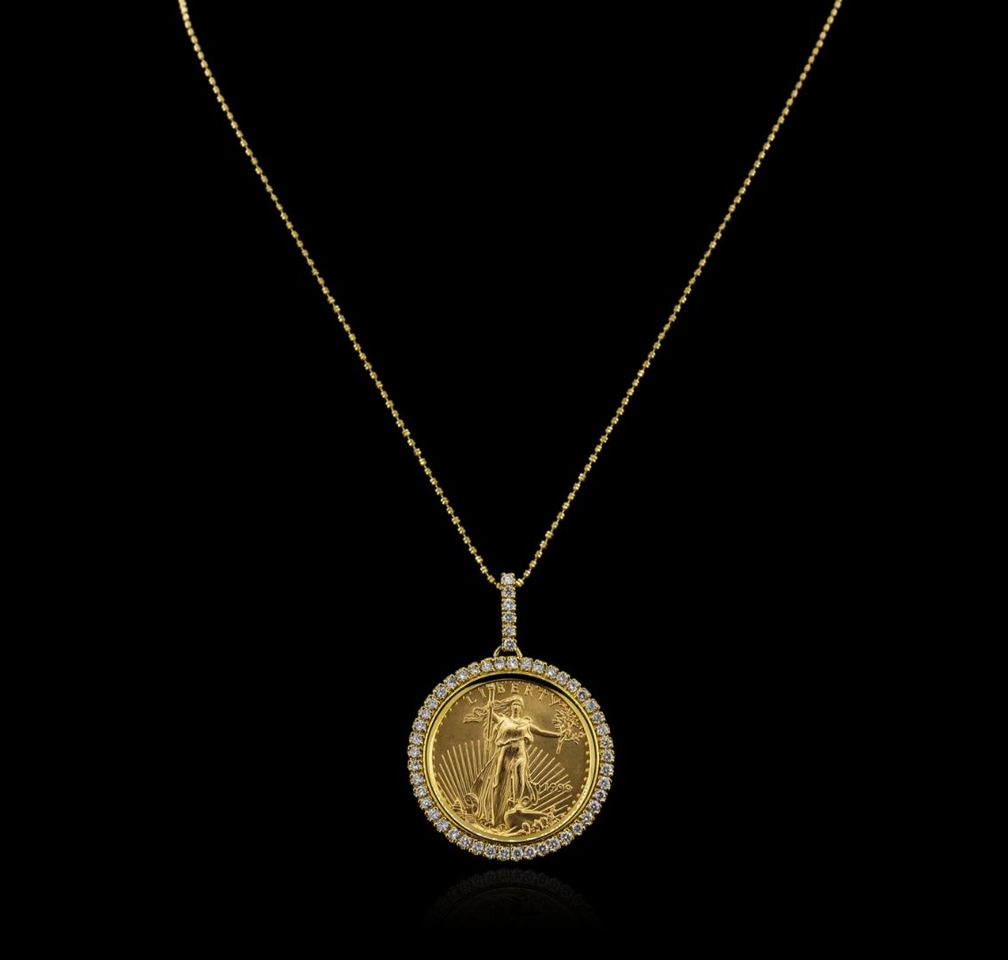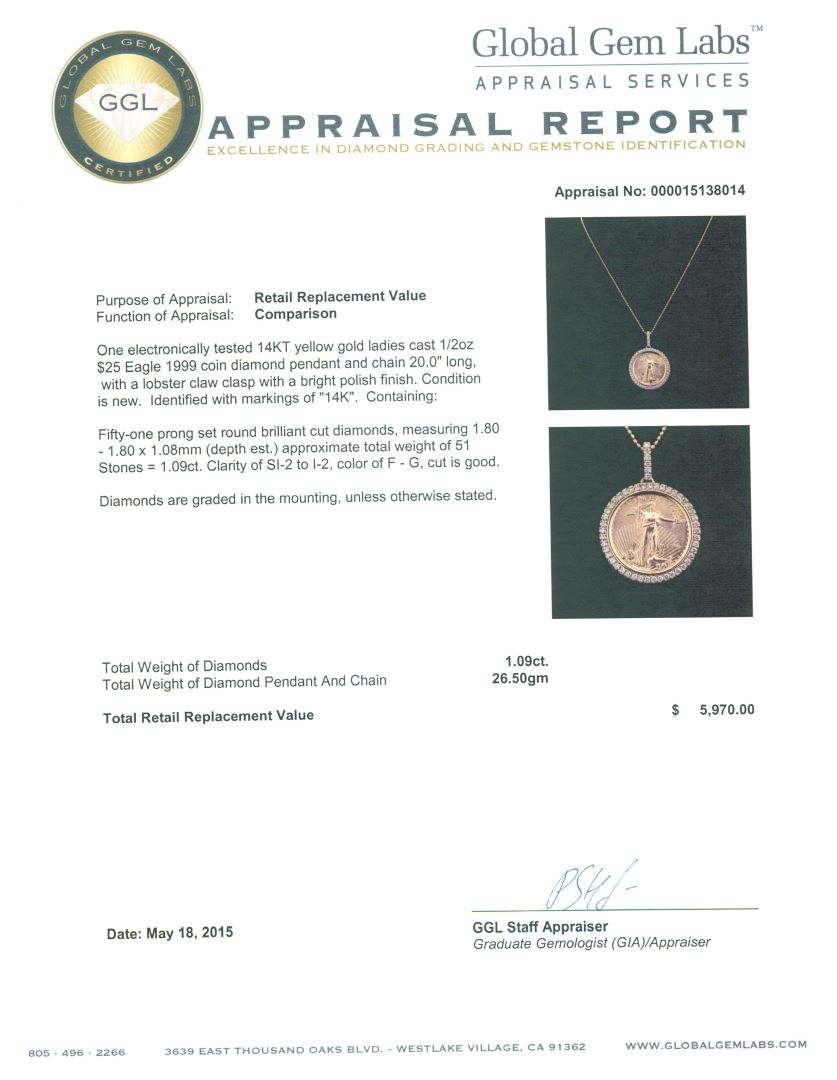 One electronically tested 14KT yellow gold ladies cast 1/2oz $25 Eagle 1999 coin diamond pendant and chain 20.0" long, with a lobster claw clasp with a bright polish finish. Identified with markings of "14K". Condition is new. Containing: Fifty-One prong set round brilliant cut diamonds, measuring 1.80 - 1.80 x 1.08mm (depth est.) approximate total weight of 51 Stones = 1.09ct. Clarity: SI-2 to I-2. Color: F - G, Cut is Good. Diamonds are graded in the mounting, unless otherwise stated. Total Weight of Diamonds 1.09ct. Total Weight of Diamond Pendant And Chain 26.50 grams. GGL Appraised at $5,970.00.