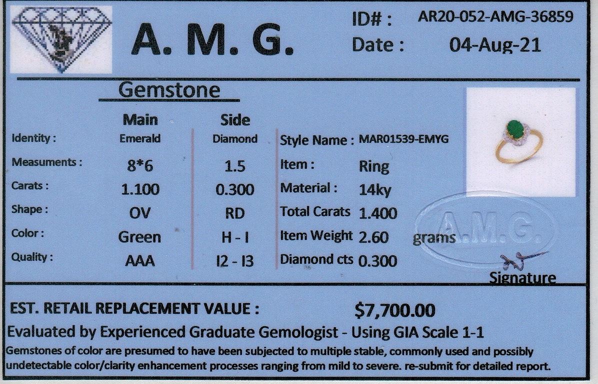 (1) Emerald with a total weight of 1.10cts. (18) round Diamonds with a total weight of 0.30cts with a color of H-I and clarity of I2-I3. Total weight of the ring is 2.60 grams. Ring size 7.5.